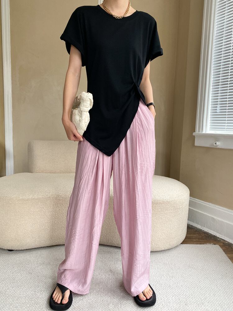 [EWQ] 裾分割プリーツ非対称 Tシャツ O ネック半袖 Tシャツ夏トレンドトップス 16O20 ショート ハーフスリーブ サマー 夏物 Oネック