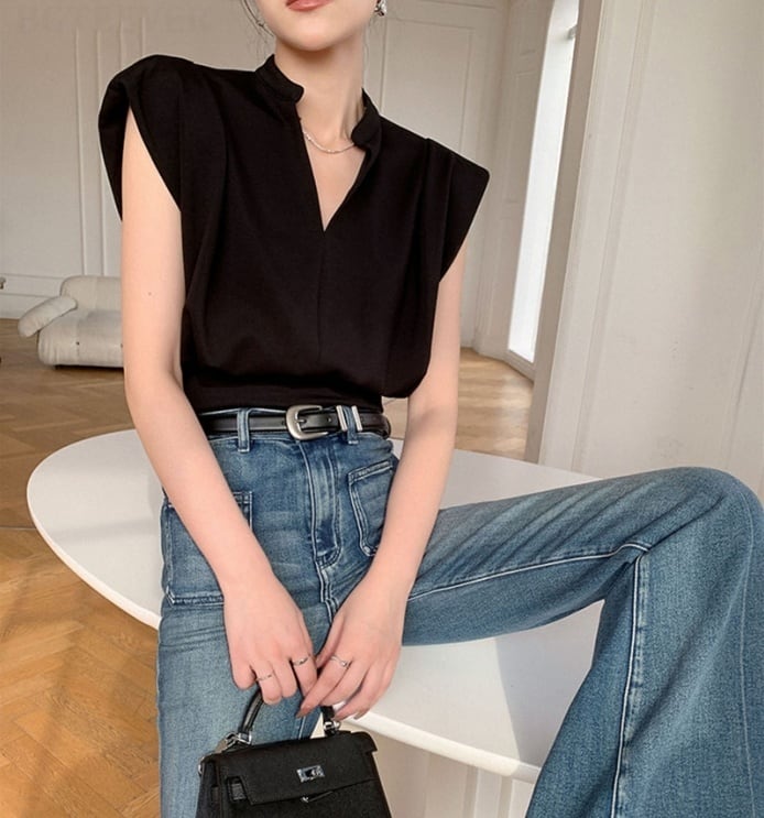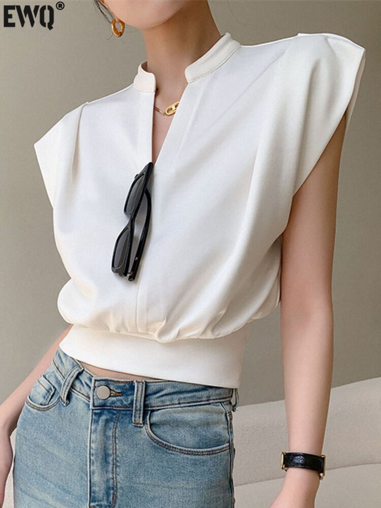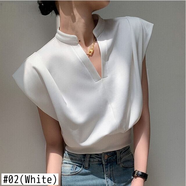 [EWQ] V ネック Tシャツルーズウエストプルオーバー夏ノースリーブ Tシャツトップス U1220 サマー 夏物 Vネック ソリッドカラー