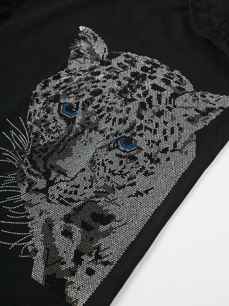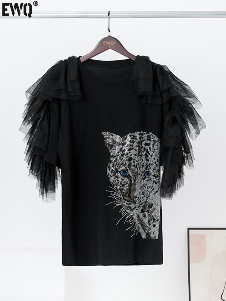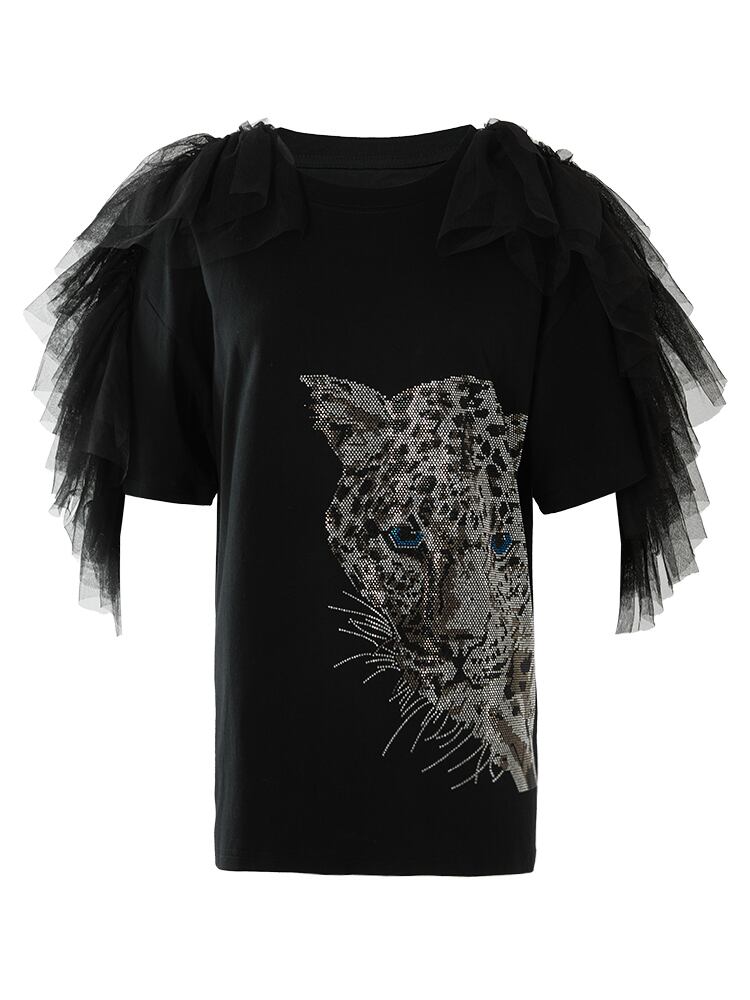 [EWQ] アニマルビーズ装飾 Tシャツ黒半袖サイドメッシュパッチワーク O ネック Tシャツ緩い夏潮 ショート ブラック ハーフスリーブ サマー 夏物 Oネック