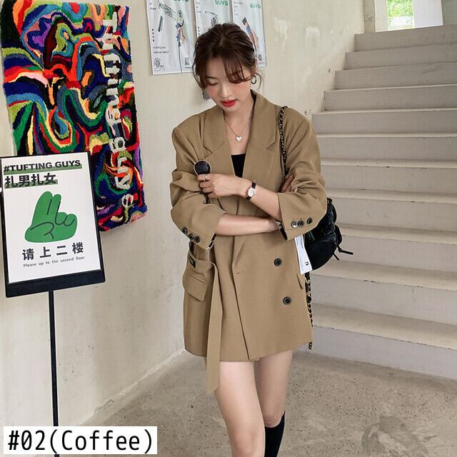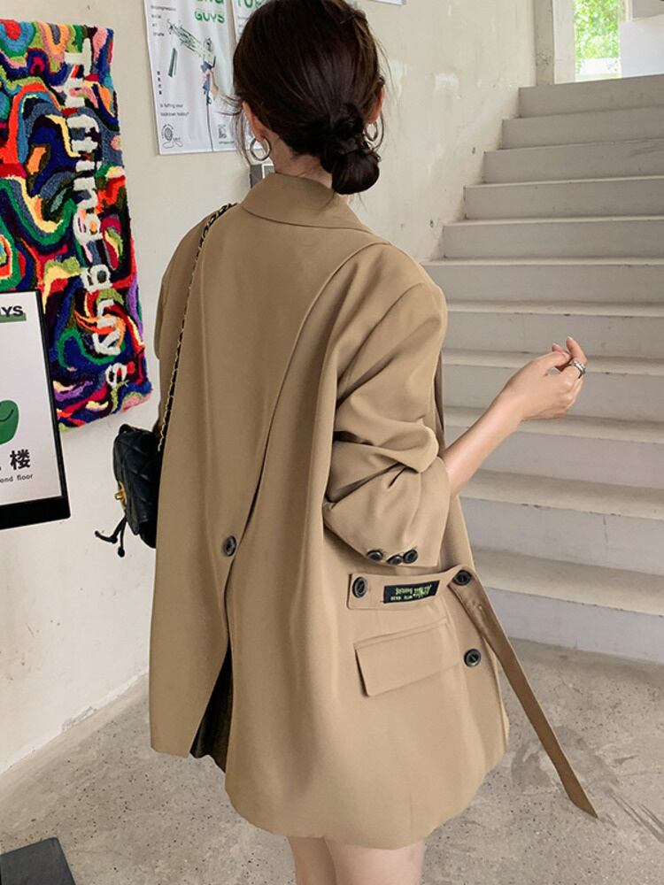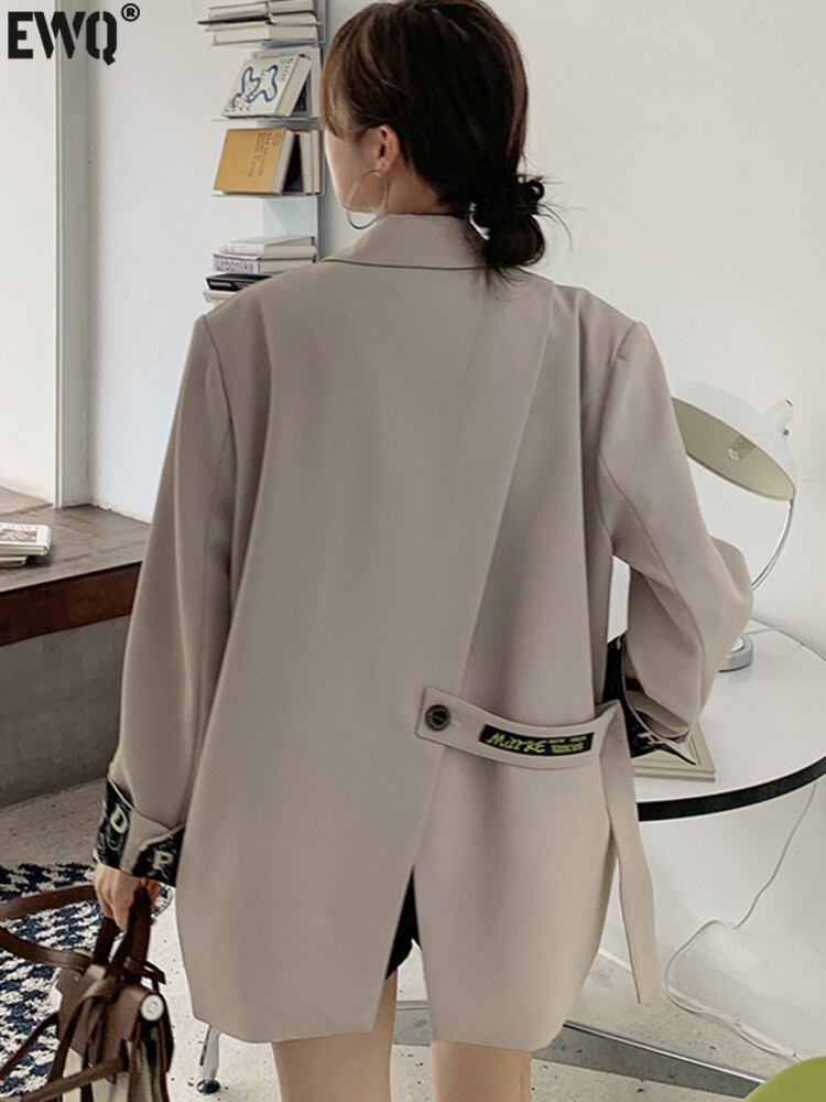 [EWQ] バックスプリット包帯ブレザーコートダブルブレストルーズ長袖レターパッチワークスーツジャケット秋潮 ロング オータム 秋物