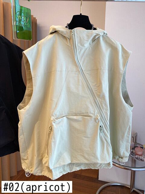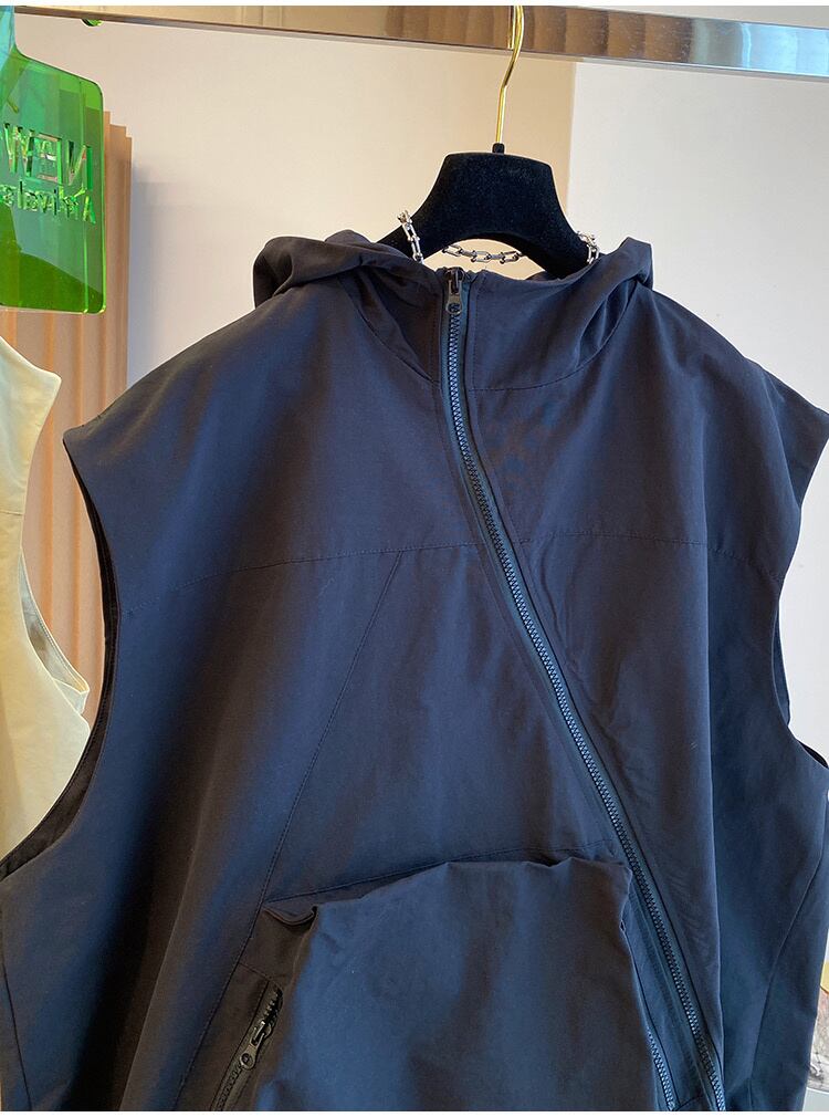[EWQ] 不規則ジッパーパッチワークフード付きベストノースリーブコート秋トレンドオールマッチブラックトップス 16O273 オータム 秋物