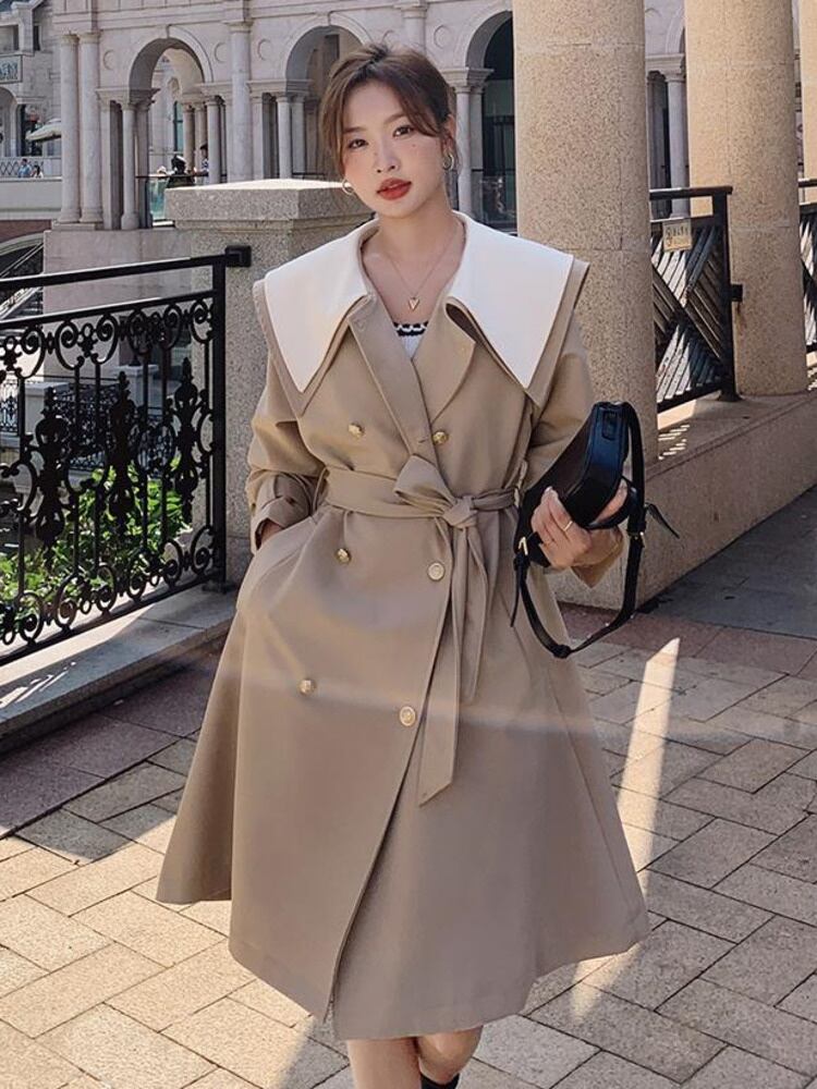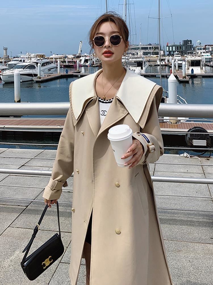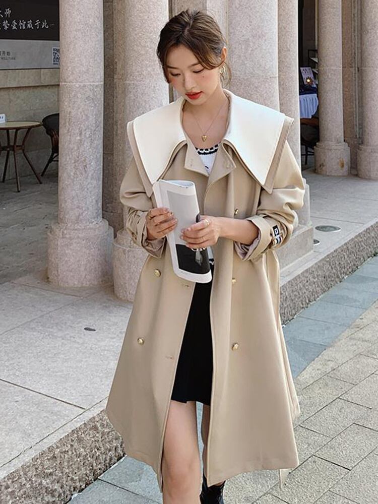 [EWQ] ピーターパン襟ベルト付きウインドブレーカーコート長袖ルーズダブルブレストトレンチジャケット秋生き抜く ロング オータム 秋物 ハーネス