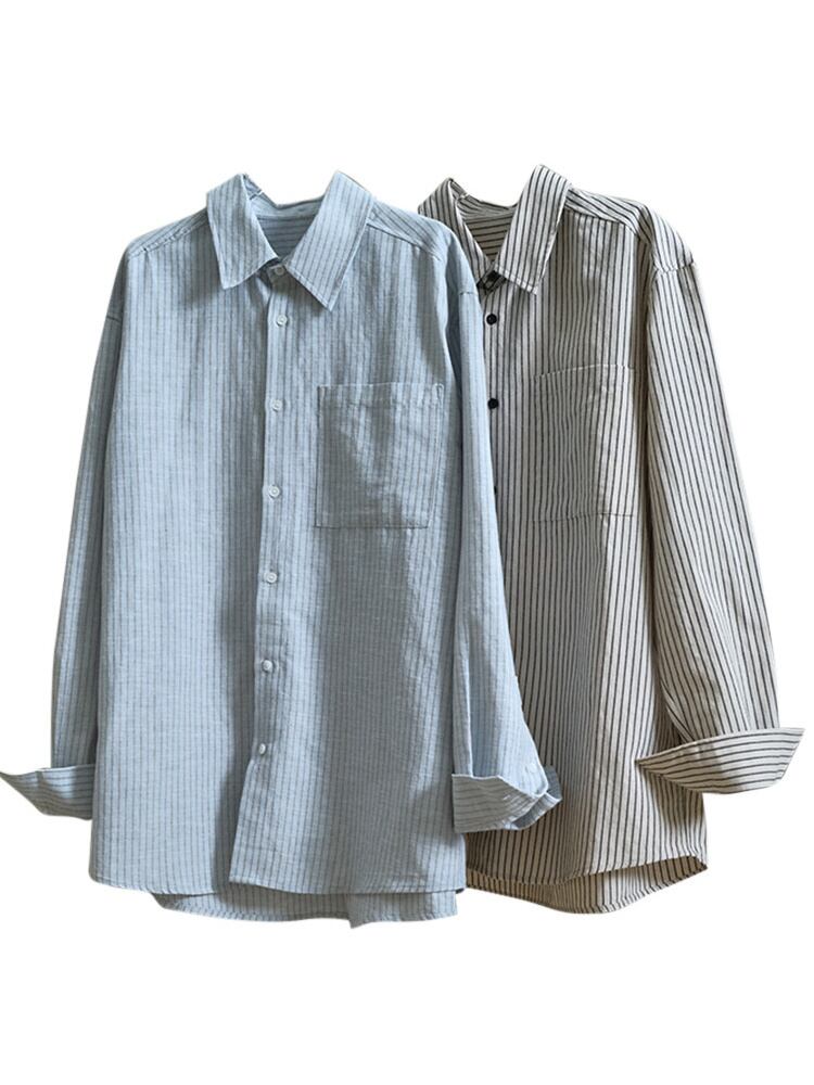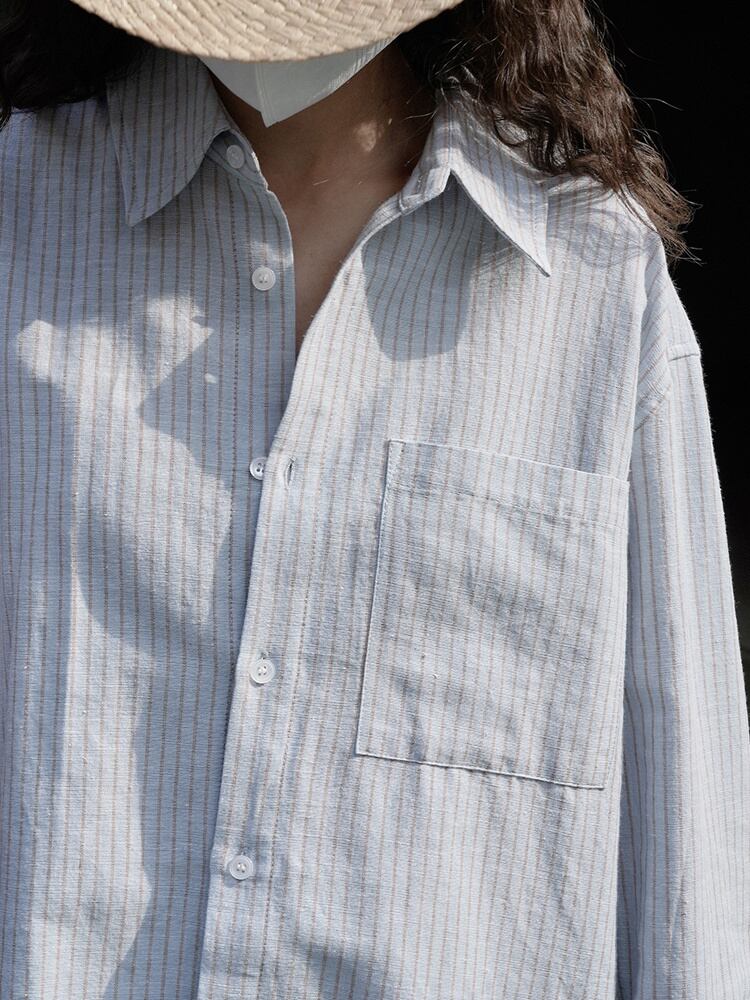 [EWQ] カラーブロックストライプラペルシングルブレスト長袖ルーズウーマンシャツサマーブラウス ロング 夏物