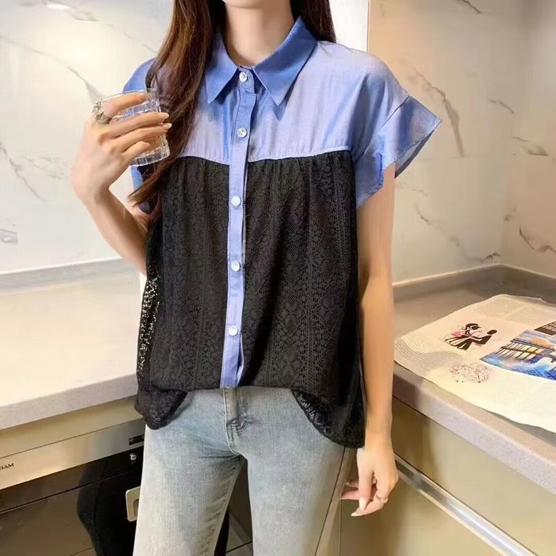[EWQ] レースパッチワークフライングスリーブデニムシャツレディースラペルルーズブラウス夏トレンド16O120 サマー 夏物