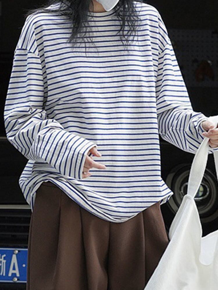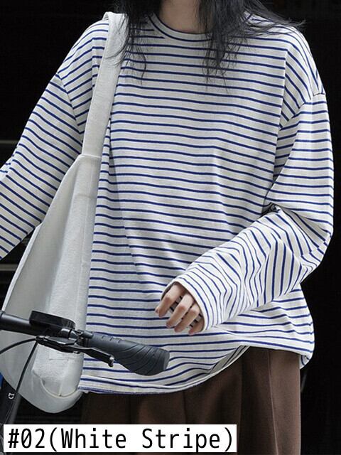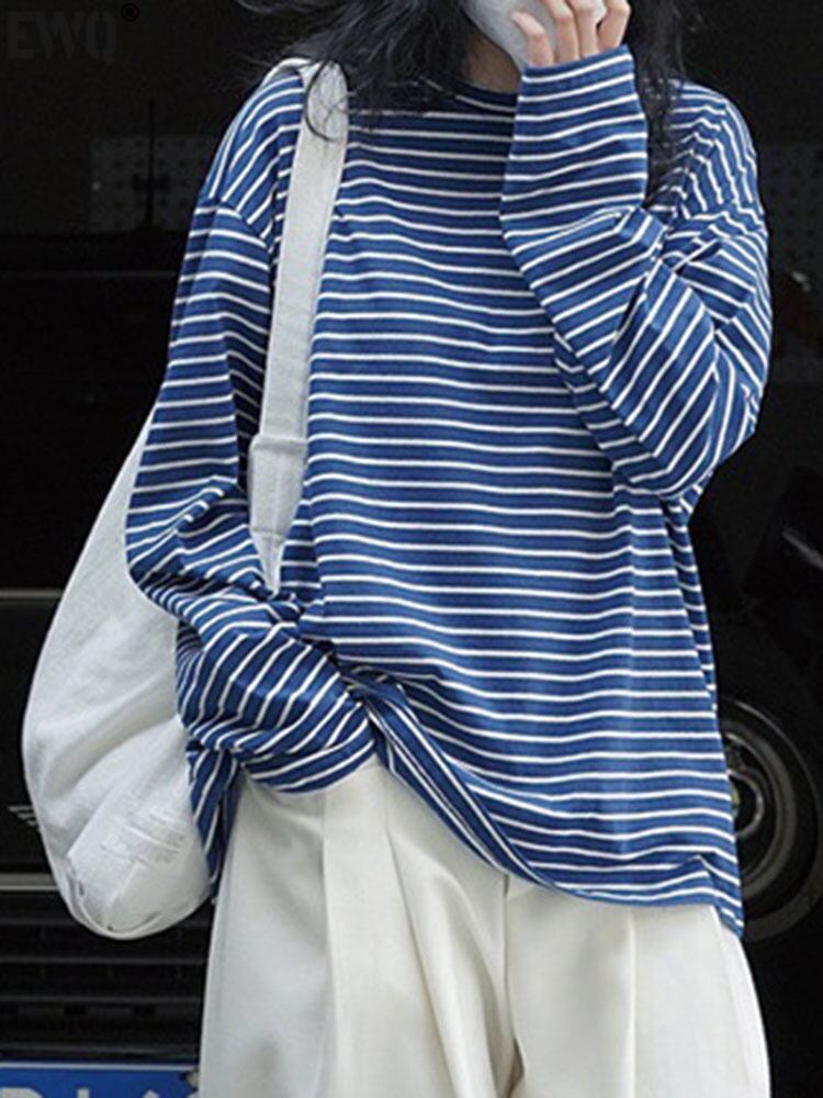[EWQ] フレンチスタイリッシュストライプ O ネックトップスだらしいルーズ長袖ベーシックブラウス秋潮 10AB5951 ロング オータム 秋物 Oネック