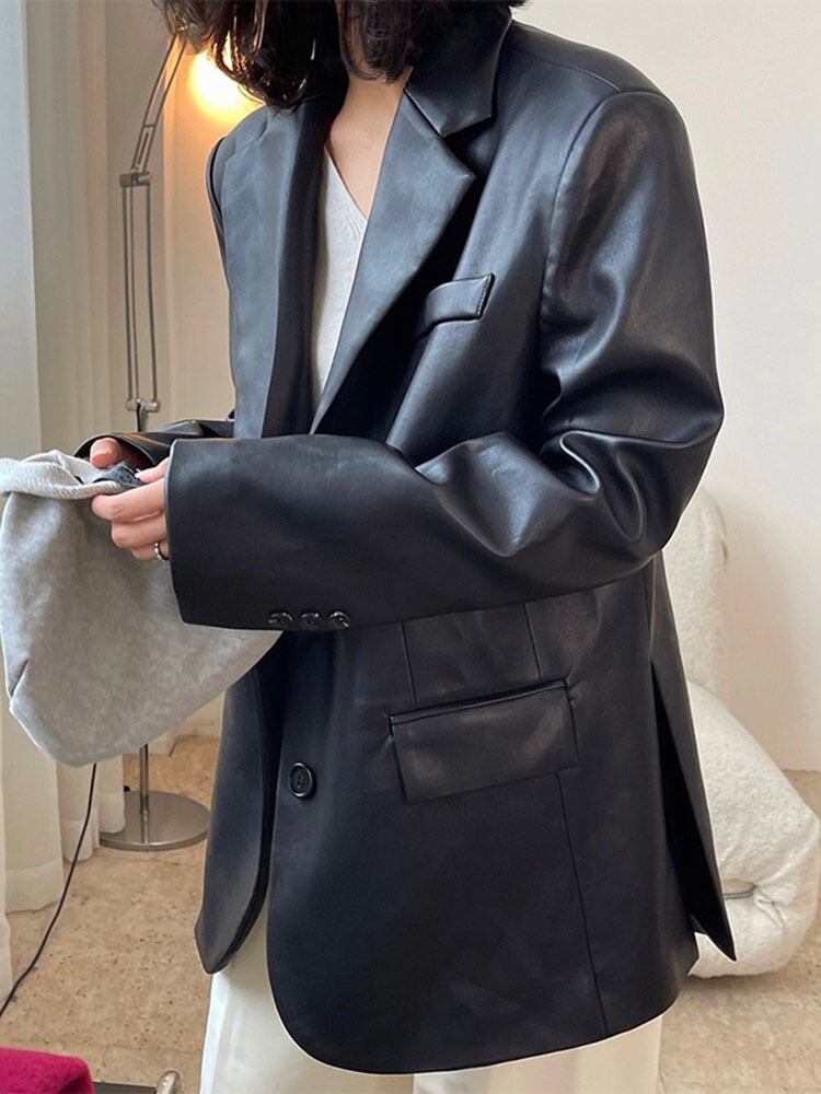 [EWQ]PUレザーシルエットスーツジャケット春秋ルーズノッチフルスリーブブレザータイド スプリング 春物 オータム 秋物