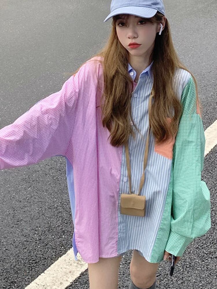 [EWQ] チェック柄ストライプパッチワークシャツルーズ長袖シングルブレストブラウストップス秋潮 16U1116 ロング オータム 秋物