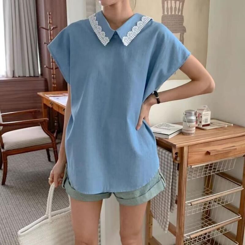 [EWQ] レーススプライス半袖シャツラペルシングルブレストルーズブラウス夏トレンド ショート ハーフスリーブ サマー 夏物