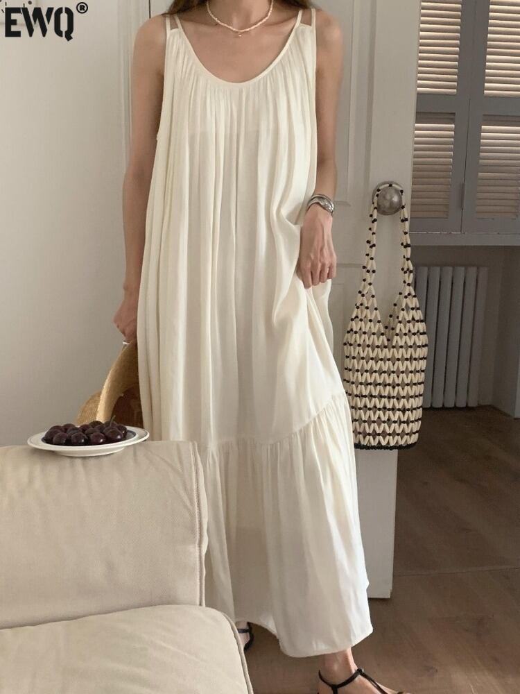 [EWQ] 背中開いたルーズロングドレスソリッドカラーフリルスプライスノースリーブベストドレス夏潮白ローブ ホワイト サマー 夏物