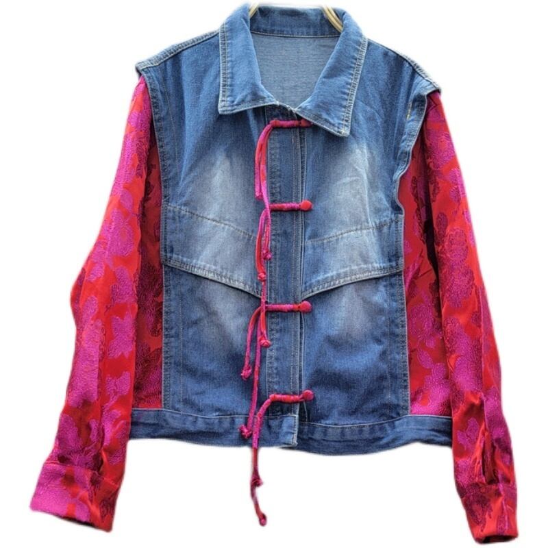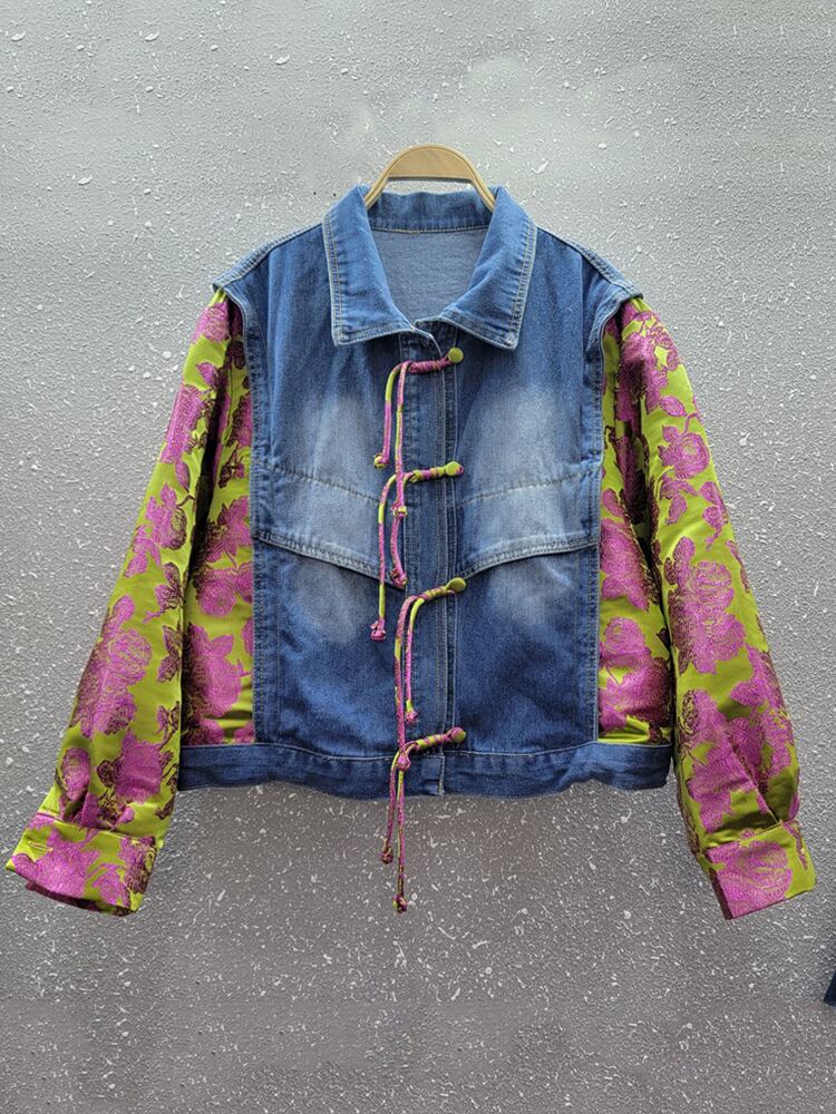 [EWQ] パッチワークデニムジャケットレースアップボタンコントラストカラープリント長袖春秋ジャケットコート ロング スプリング 春物 オータム 秋物