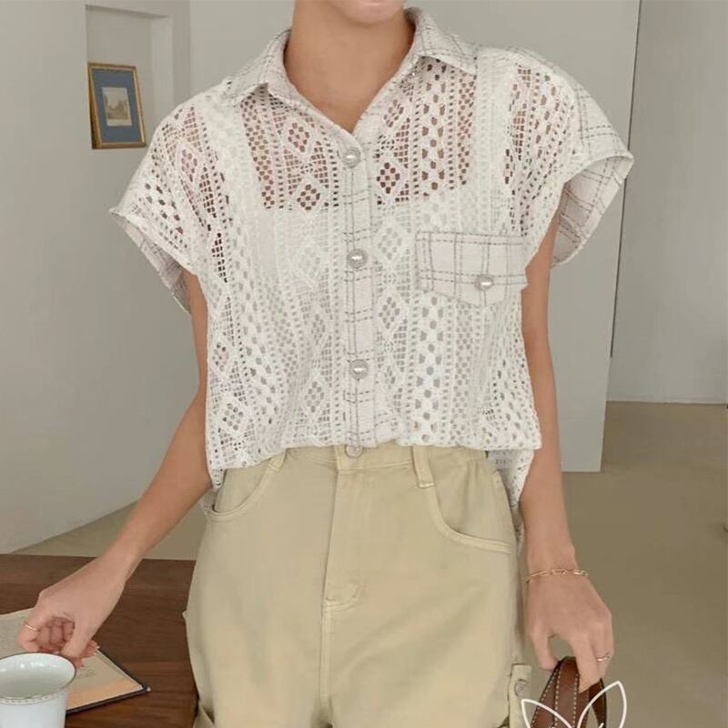 [EWQ] 中空チェック柄パッチワークシャツラペルガーメントスリーブブラウス夏トレンド 16O121 サマー 夏物