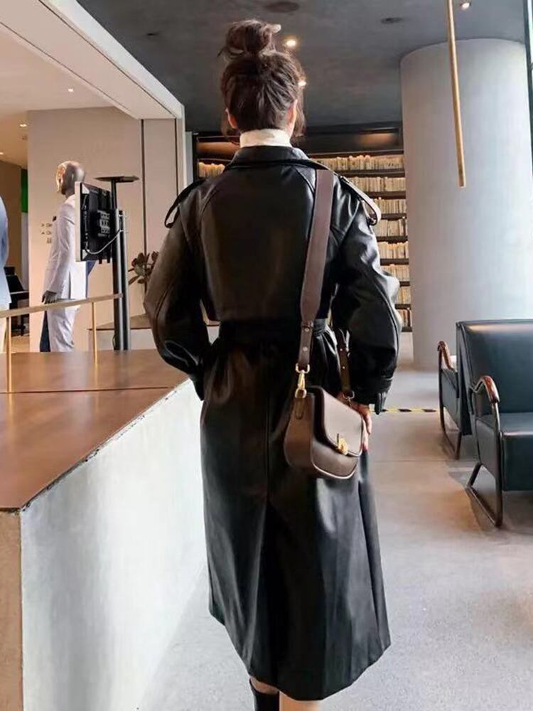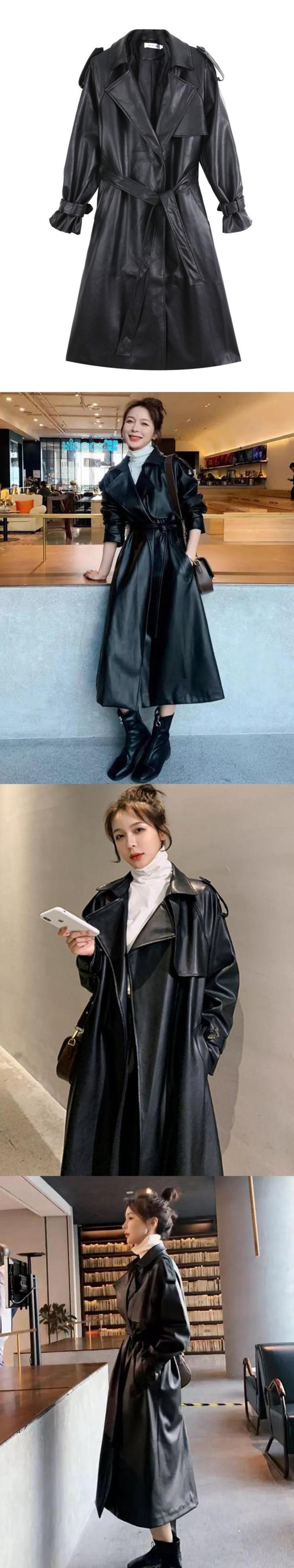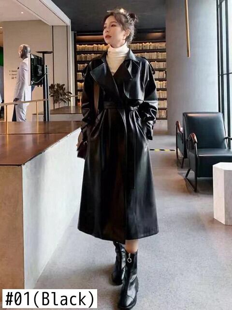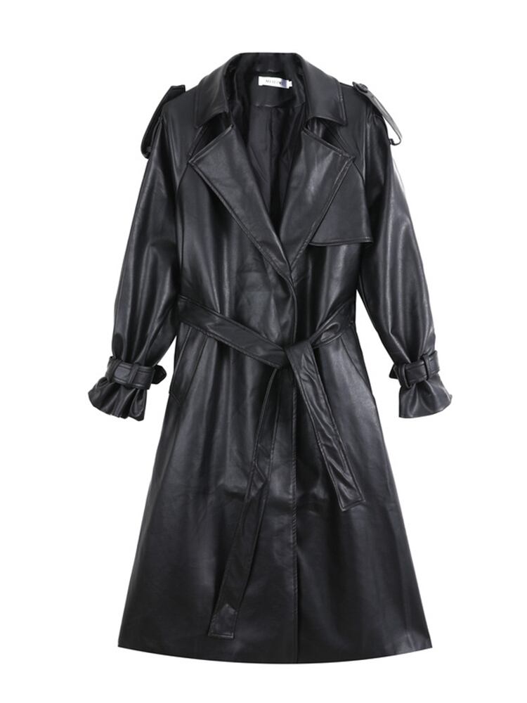 [EWQ] レースアップ PU レザー ウインドブレーカー コート レディース 長袖 ルーズ ブラック トレンチ ジャケット 秋潮生き抜く ロング オータム 秋物