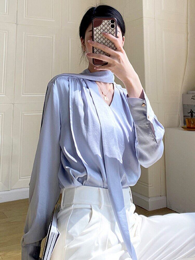 [EWQ] エレガンソリッド V ネックレースアップボタンルーズパッチワークシャツオフィスレディルーズベーシックブラウス秋潮 23A256 オータム 秋物 Vネック ソリッドカラー 会社 学校 通勤や通学にも