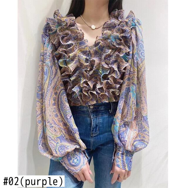 [EWQ] プリント菌スプライス シャツ ルーズ ランタン スリーブ コントラスト カラー V ネック ブラウス 秋服 薄手 ランタンスリーブ オータム 秋物 Vネック