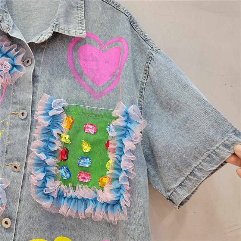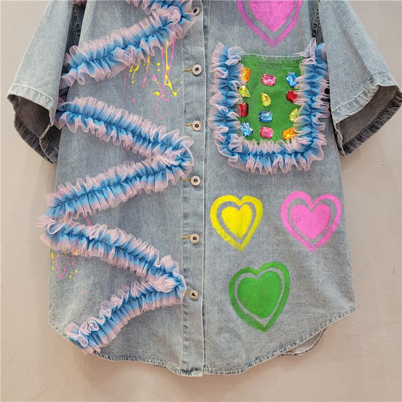 [EWQ] ダイヤモンド メッシュ スプライス ポケット シャツ シングルブレスト ルーズ レディース 半袖 サマー ラブ プリント トップ ショート ハーフスリーブ 夏物