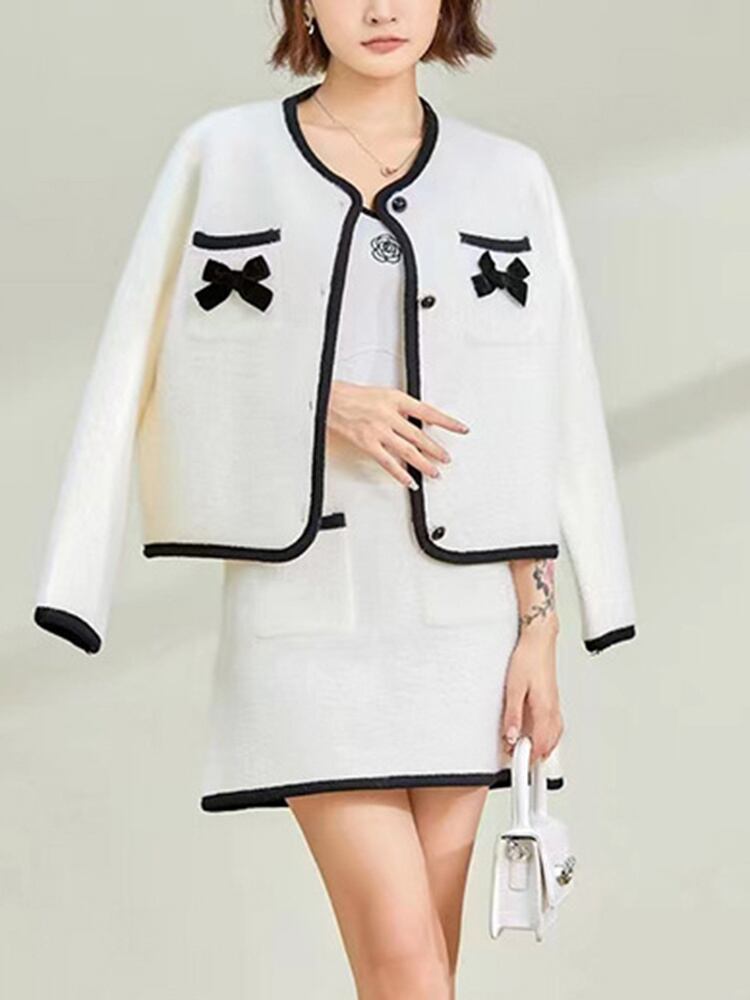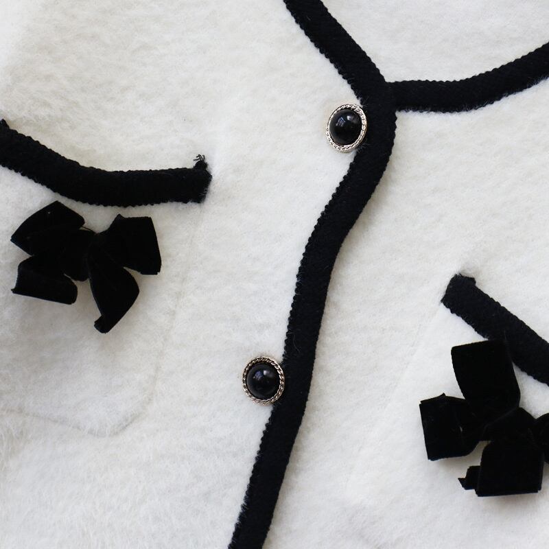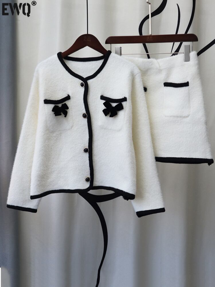 [EWQ] 模造ミンクベルベットニット 2 点セット弓パッチワークパーティージャケット + ウエストスカート秋潮スーツ リボン オータム 秋物
