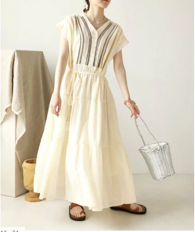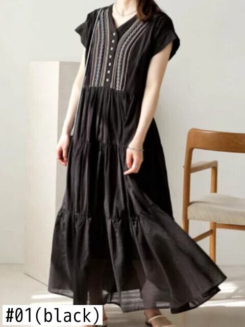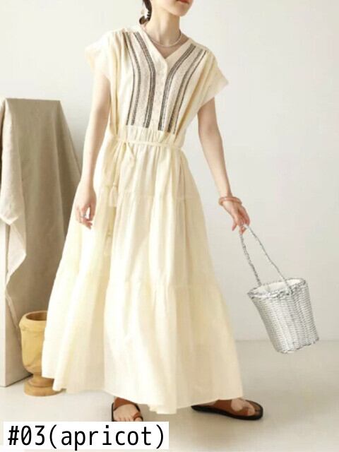 [EWQ] 刺繍 V ネックレースアップドレスルーズシングルブレストフリルドレス夏トレンド 694 ラッフル サマー 夏物 Vネック
