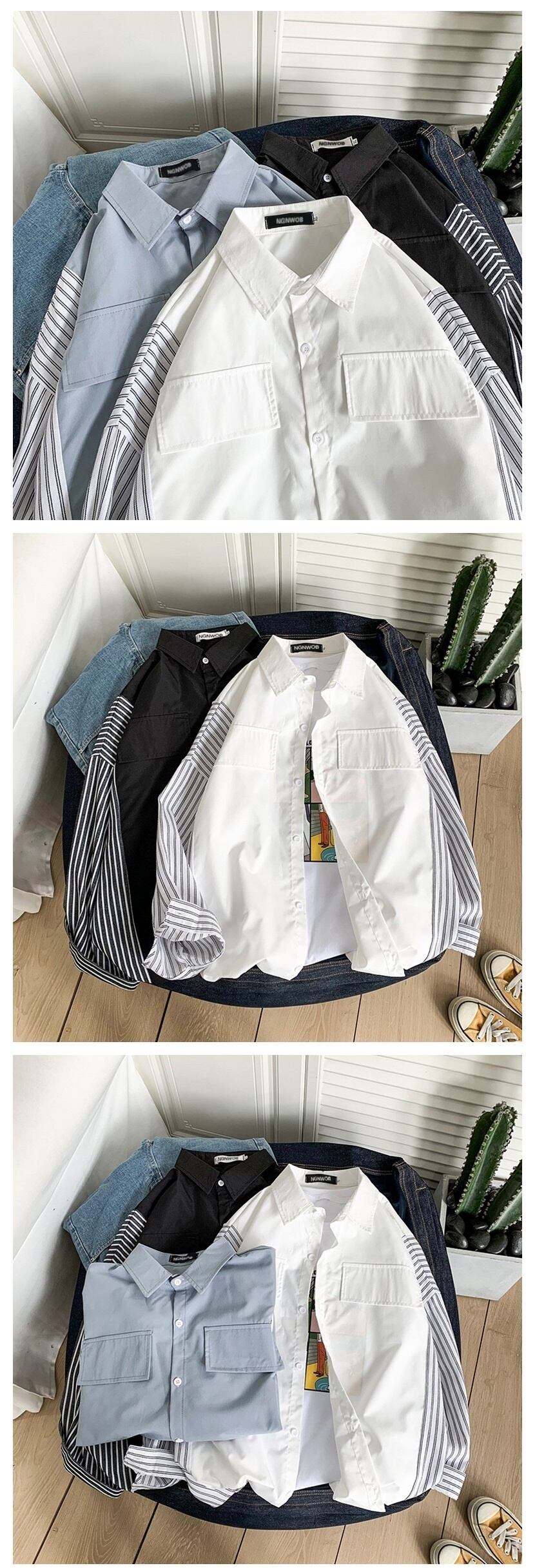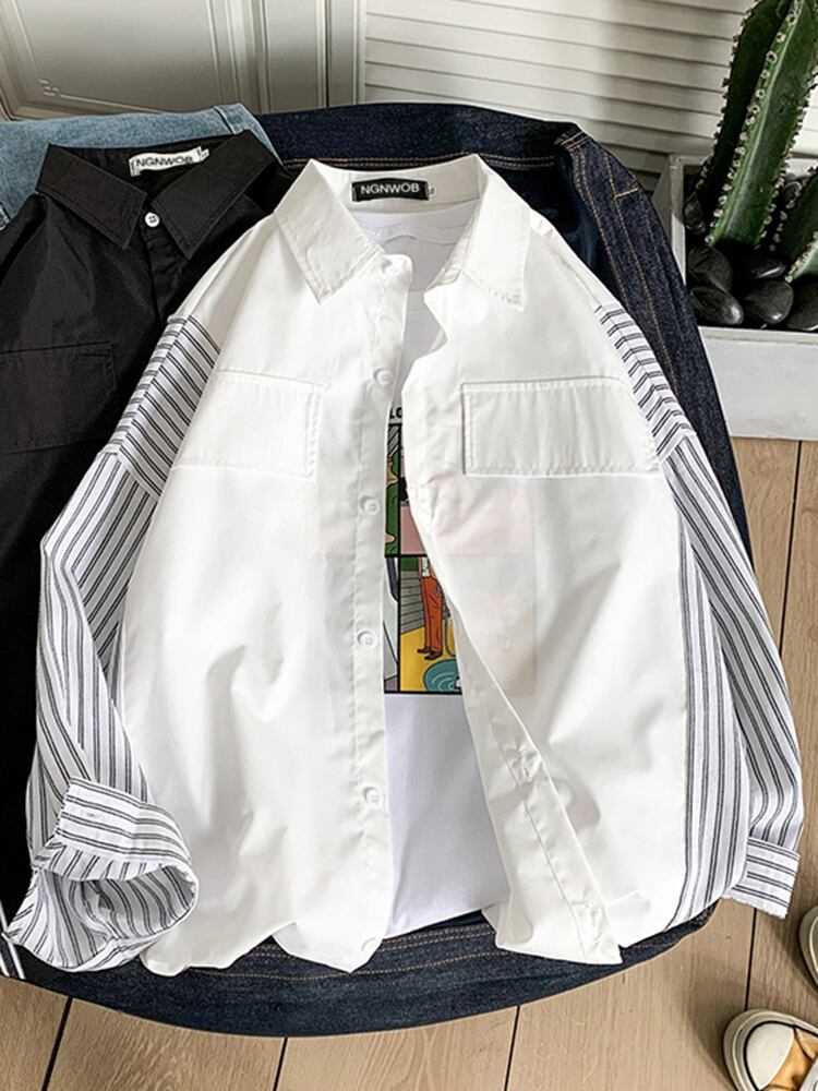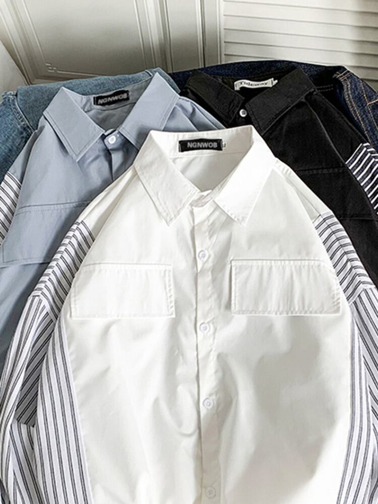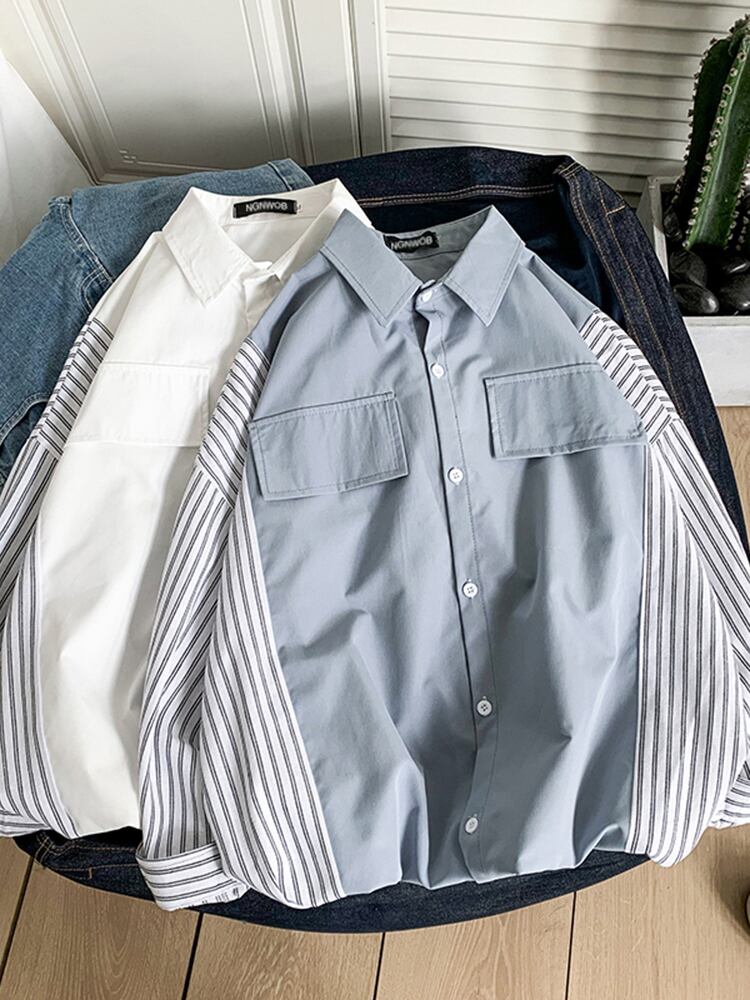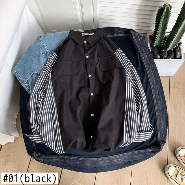 [EWQ] フェイクツーピースストライプシャツラペル長袖ルーズブラウス秋潮シックトップ ロング オータム 秋物