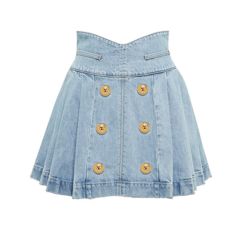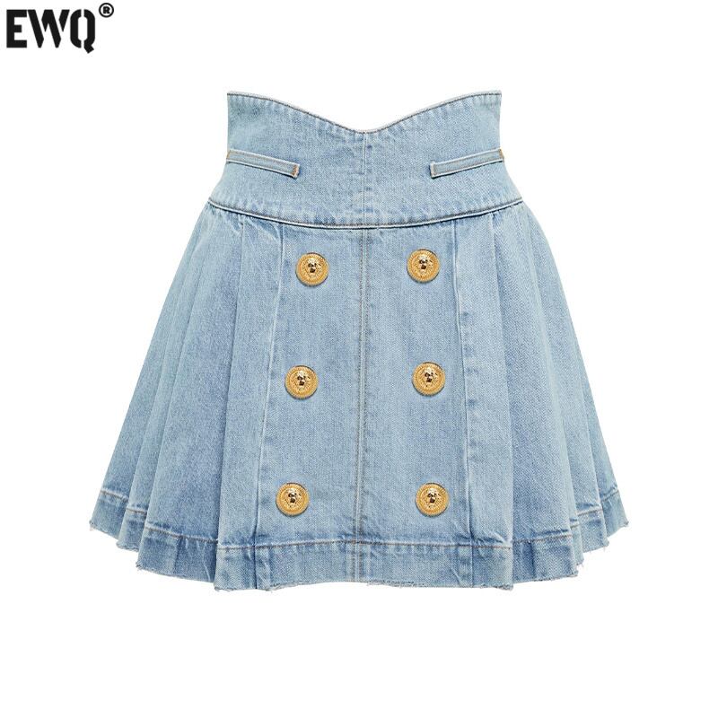 [EWQ] 夏 レディース ミニ デニム スカート パッチワーク プリーツ ジッパー ダブルブレスト スカート タイド 16U1238 サマー 夏物