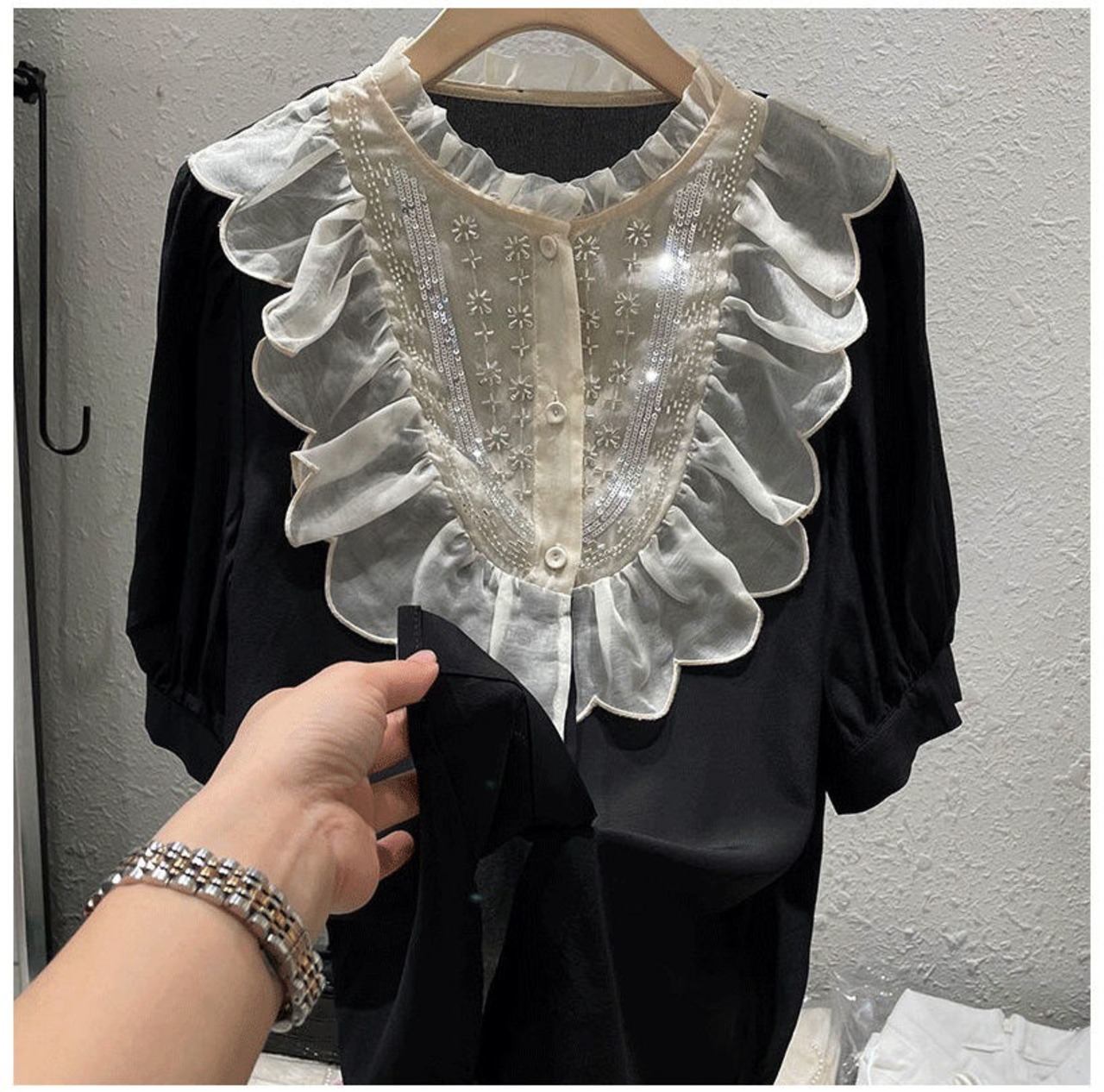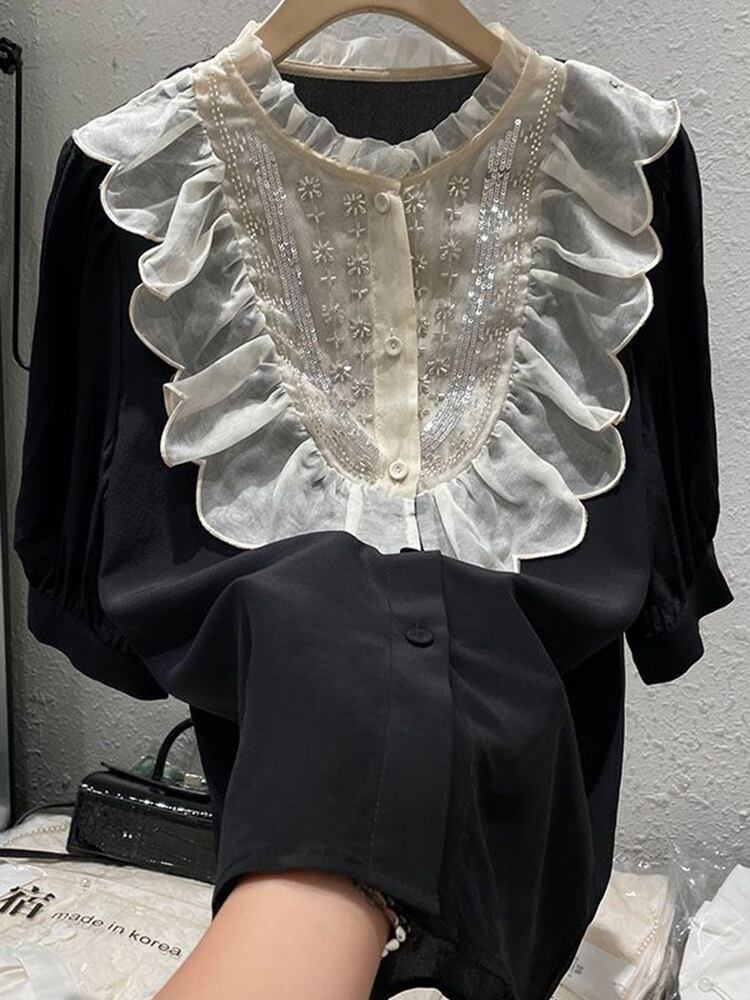 [EWQ] フリルパッチワークコントラストシャツゆったり半袖レディースビッグサイズブラウス夏潮シングルブレストトップ 16U930 ショート ハーフスリーブ サマー 夏物