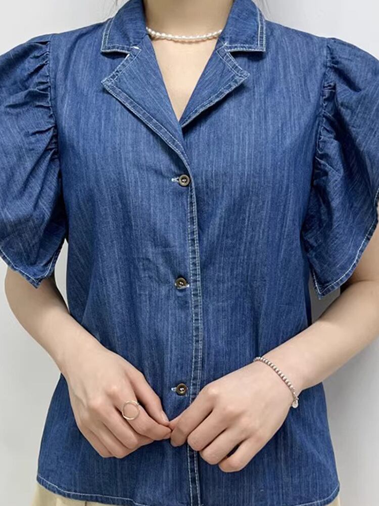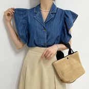 [EWQ] ノッチフリルパッチワーク半袖シャツレディースシングルブレストルーズブラウス夏 ショート ハーフスリーブ ラッフル サマー 夏物