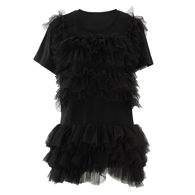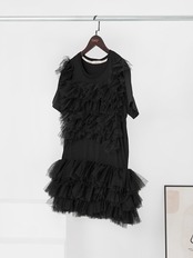 [EWQ] ブラックメッシュパッチワークミニドレス半袖ルーズフリルガーゼスプライシングドレス夏服 U862 ショート ハーフスリーブ サマー 夏物