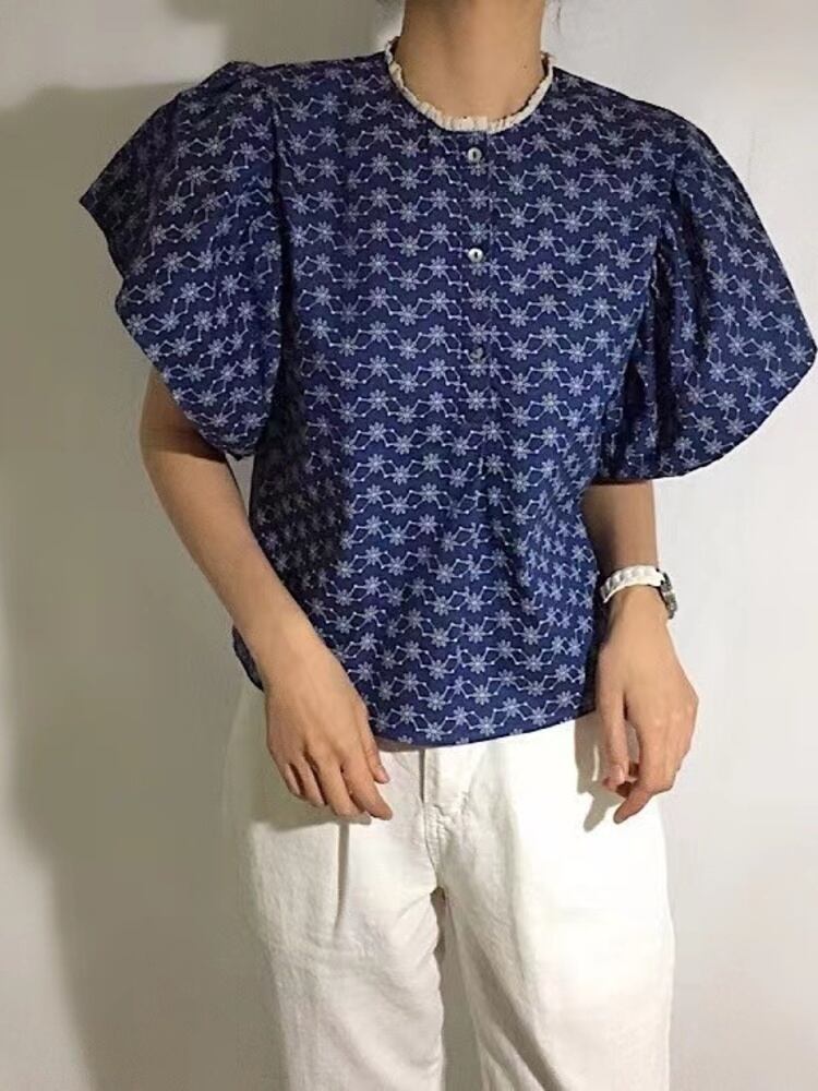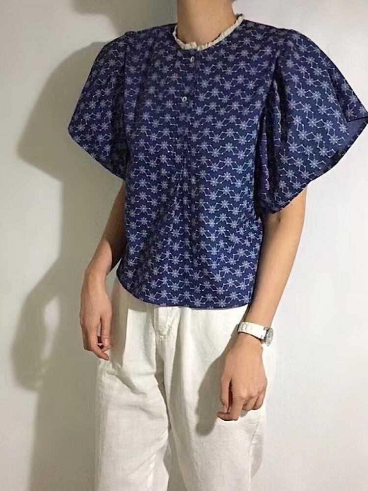 [EWQ] パッチワークラウンドネックシャツ花柄ルーズフライングスリーブ夏潮コントラストトップ 260 サマー 夏物 Oネック