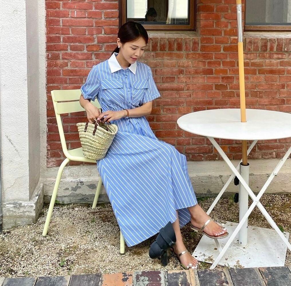 [EWQ] ストライプシャツドレス半袖ラペルコントラスト巾着ドレス夏潮 Vestido ショート ハーフスリーブ サマー 夏物