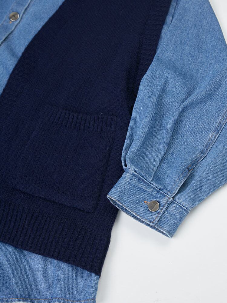 [EWQ] デニムパッチワークルーズカーディガンコート長袖シングルブレストコントラストセータージャケット秋服 ロング オータム 秋物