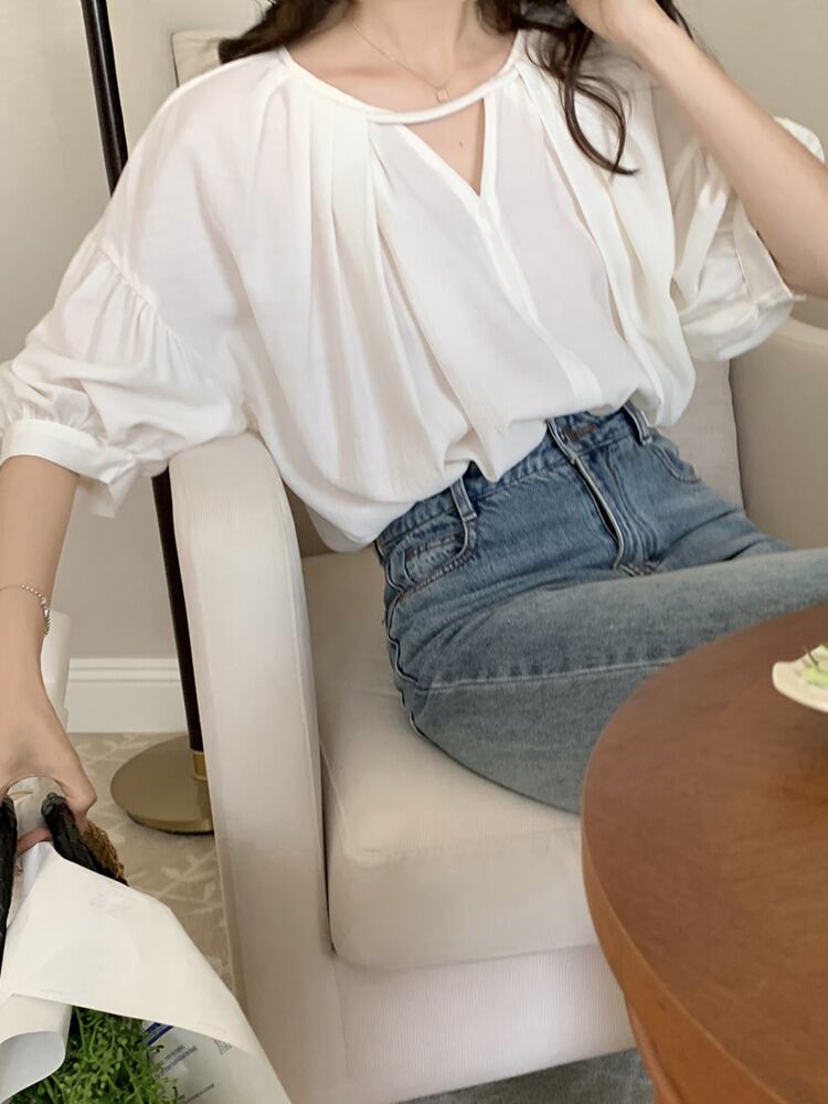 [EWQ] ハーフオープンカラー白シャツラングル肩袖ルーズブラウス夏潮トップ 16U1098 ホワイト サマー 夏物