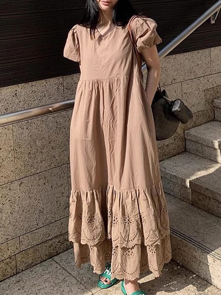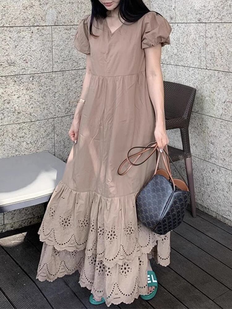 [EWQ] 気質裾フックフラワー中空パッチワークトランペットドレスパフスリーブドレス夏潮 サマー 夏物 フラワーデザイン