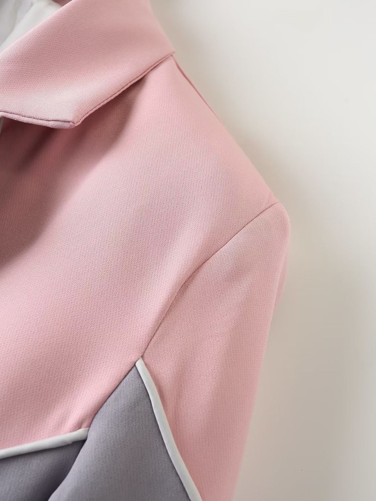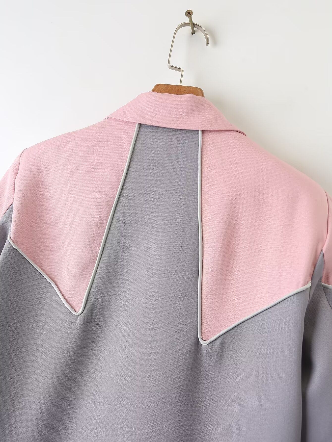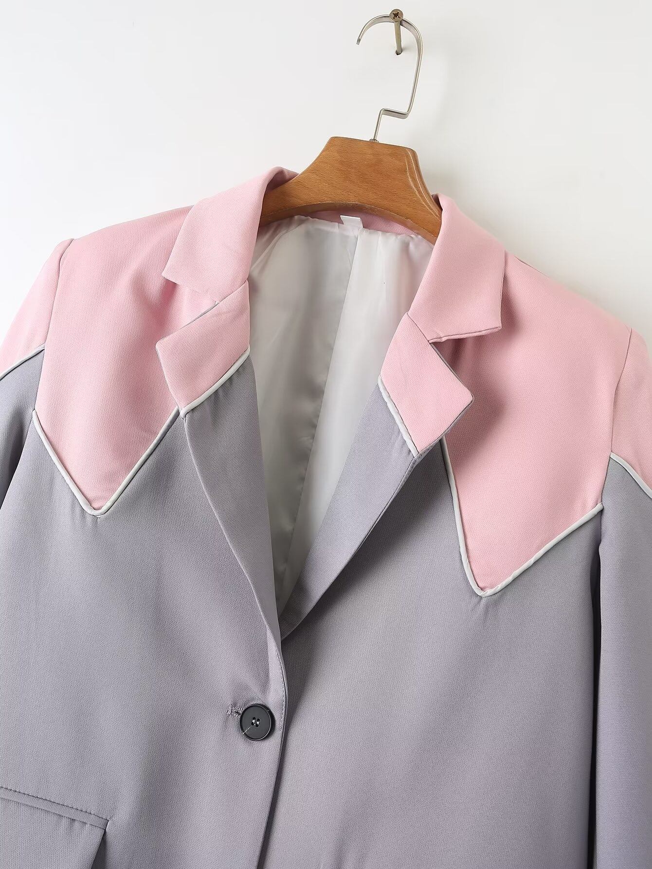 [EWQ] パッチワークコントラストブレザーコート 2 ボタンポケットルーズスーツジャケット秋潮長袖ブレザー ロング オータム 秋物