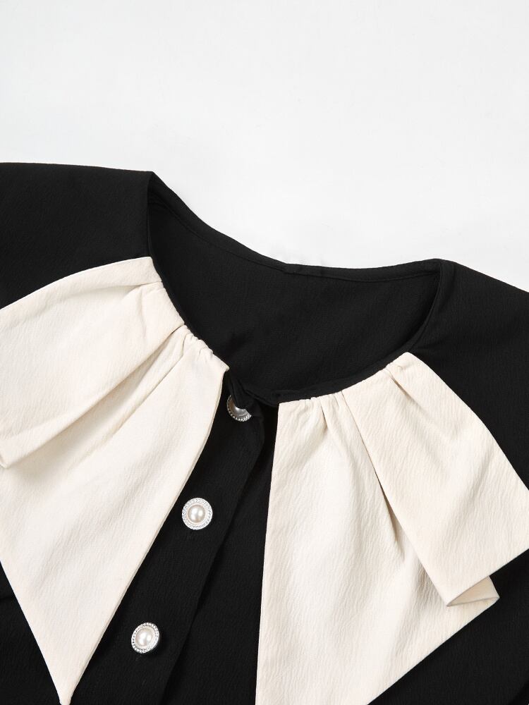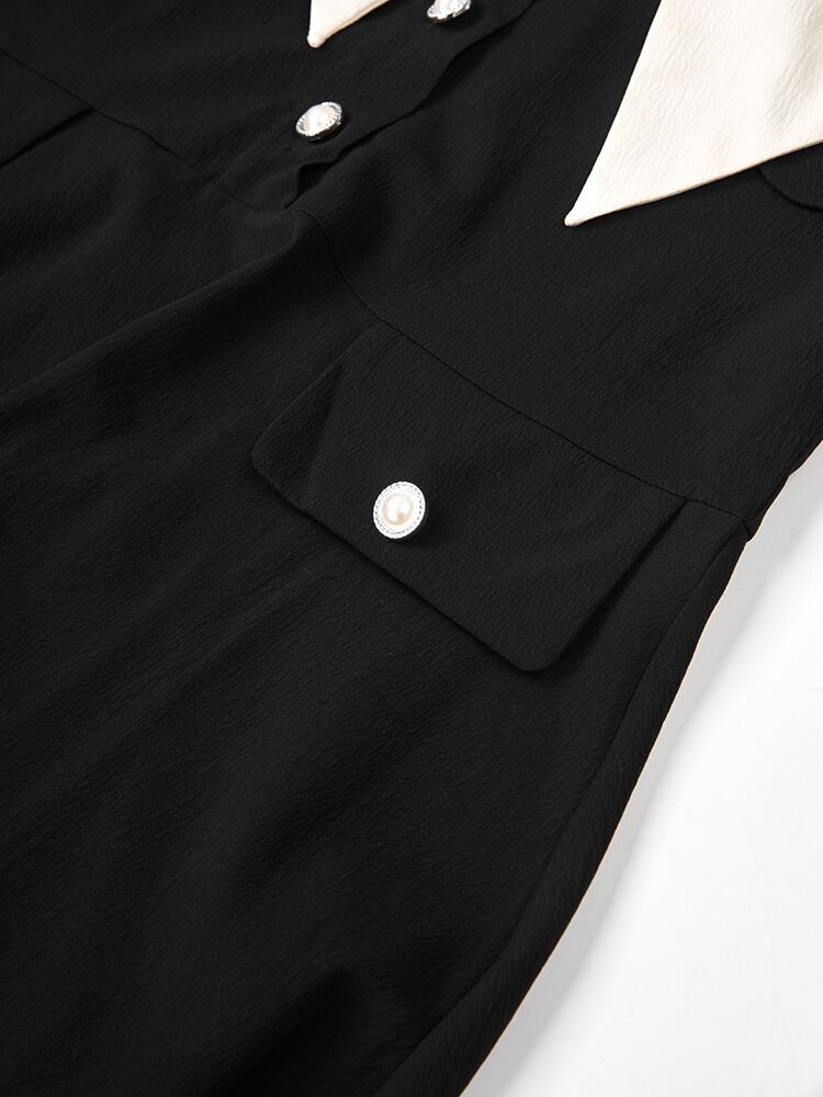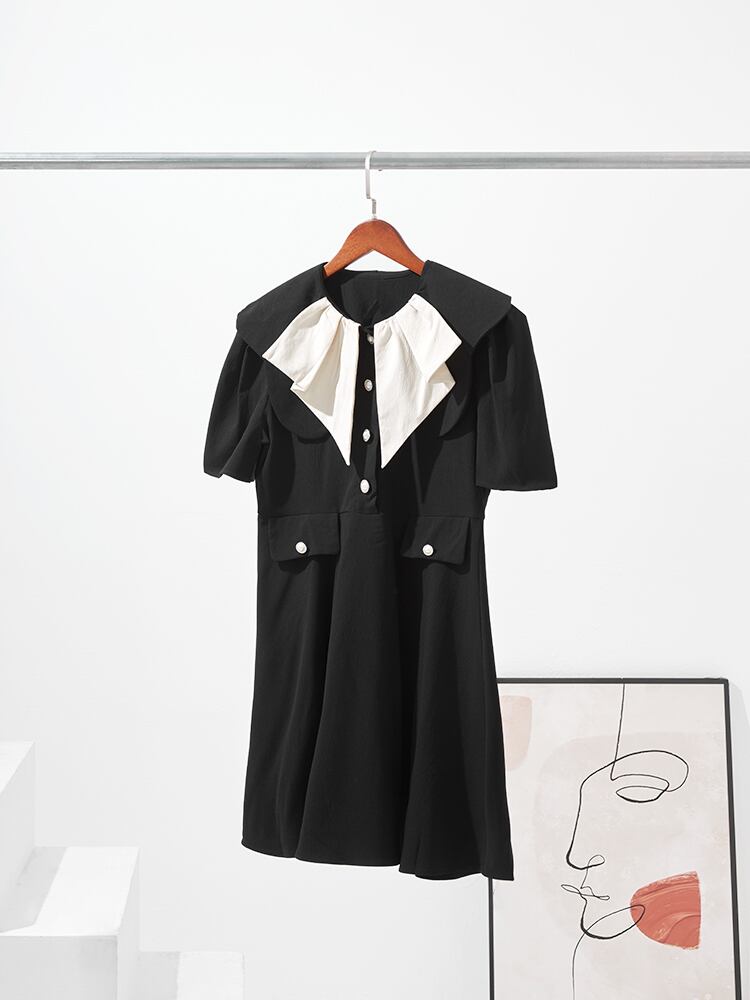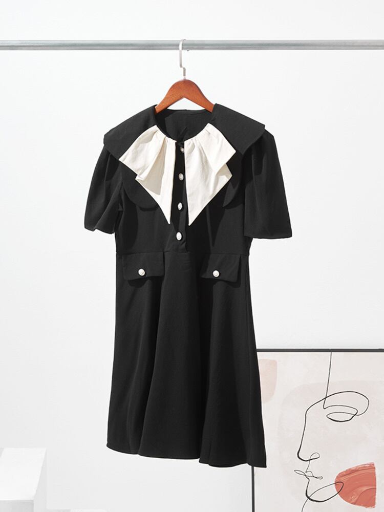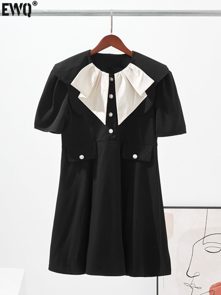 [EWQ] ピーターパン襟コントラストドレスボタン装飾半袖ドレス夏潮 Vestido ショート ハーフスリーブ サマー 夏物