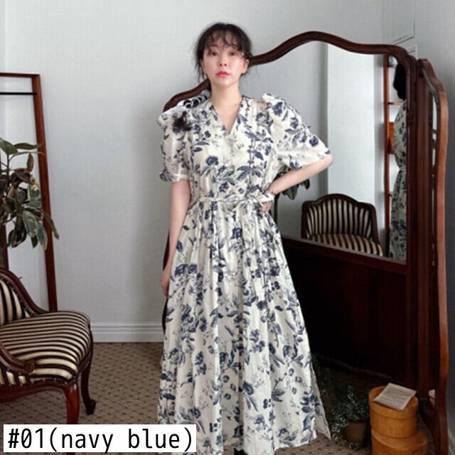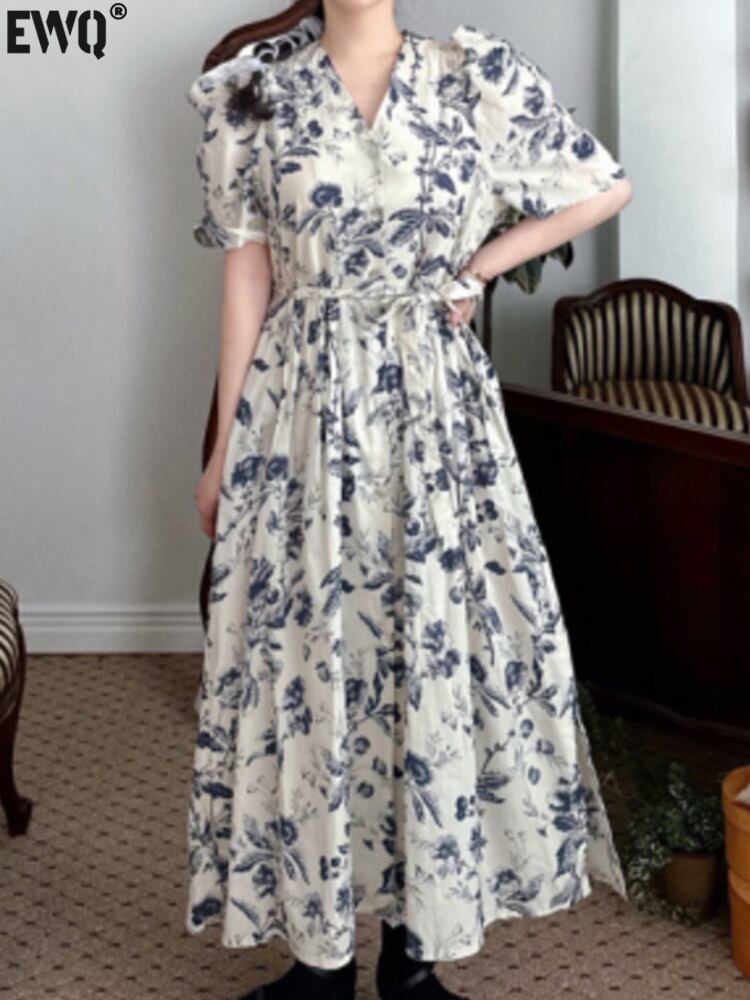 [EWQ] V ネックコントラストフラワードレスバブルスリーブレースアップシングルブレストカジュアルドレスサマータイドローブ 夏物 Vネック フラワーデザイン