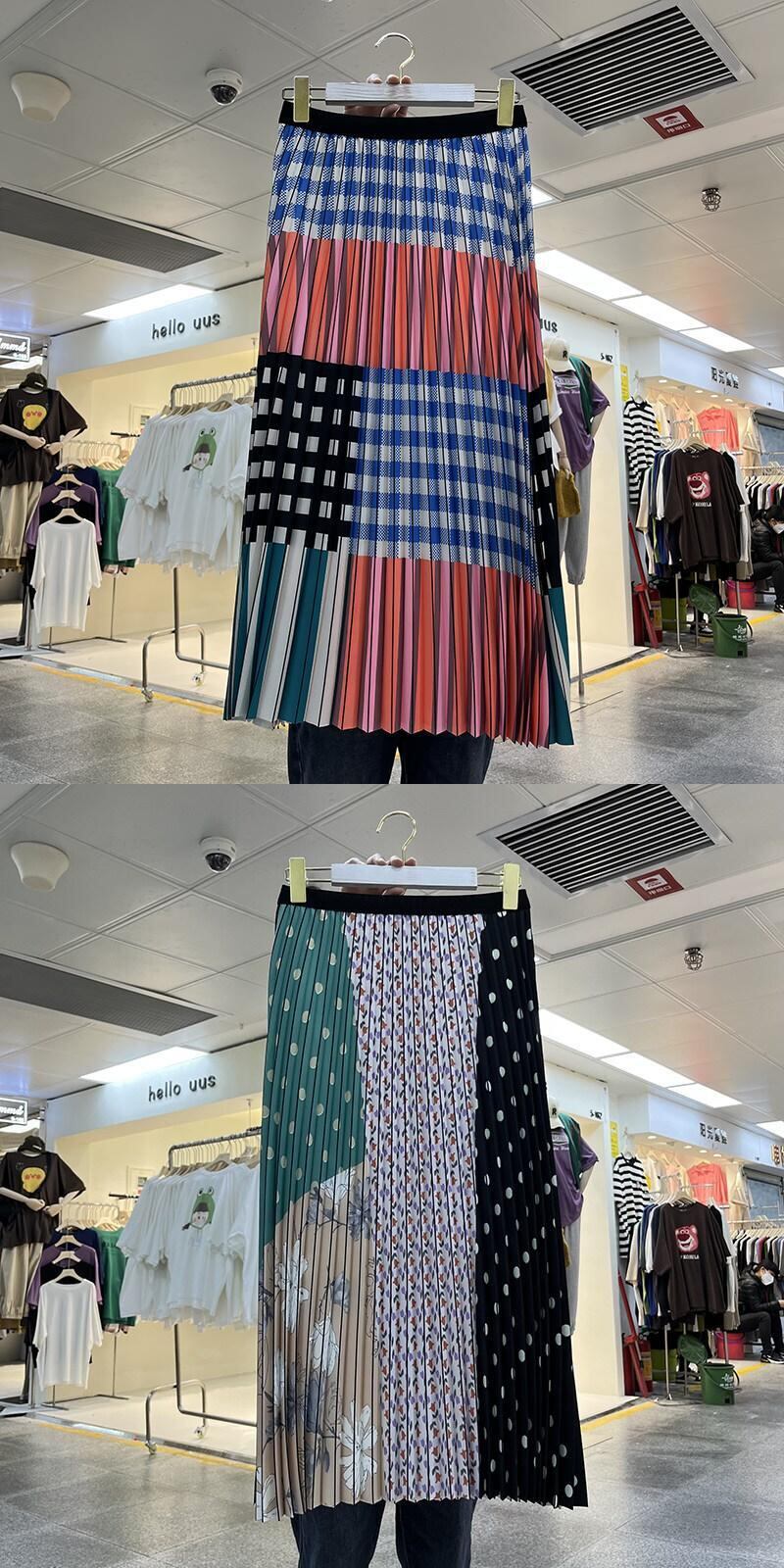 [EWQ] ポルカドットプリントプリーツスカートウエスト弾性コントラストミッドカーフスカート夏潮 エラスティック 伸縮 サマー 夏物