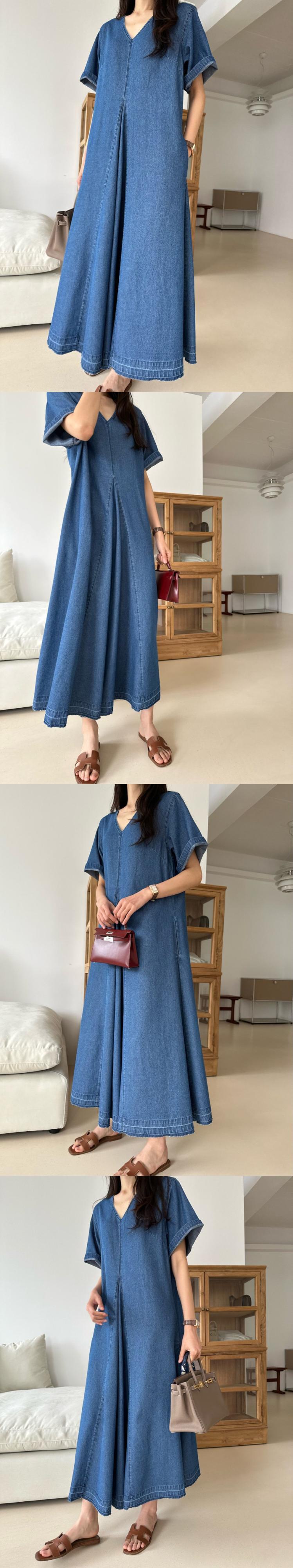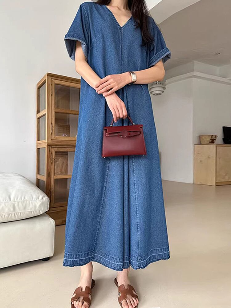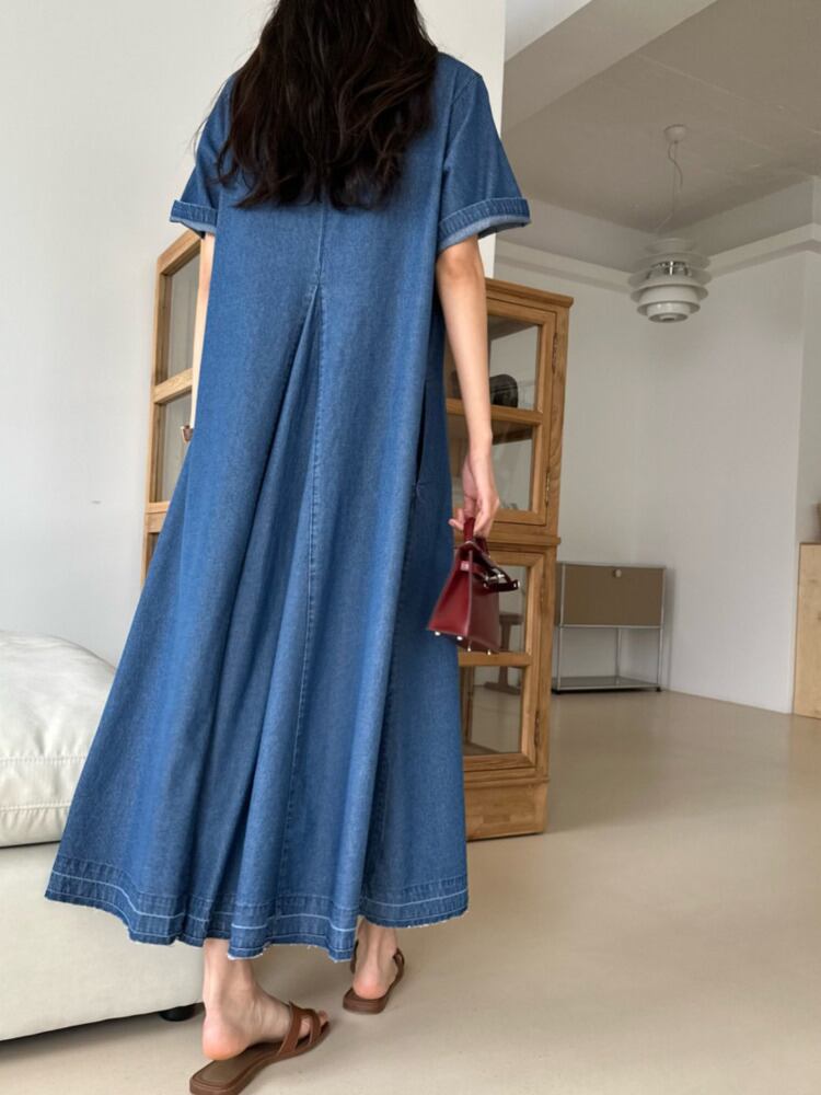 [EWQ] V ネック半袖デニムドレスプリーツルーズジーンズドレス夏潮 Vestido ショート ハーフスリーブ サマー 夏物 Vネック