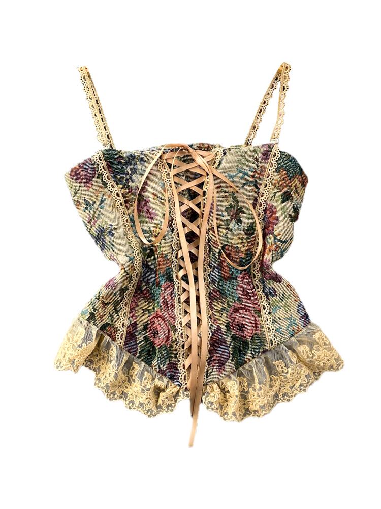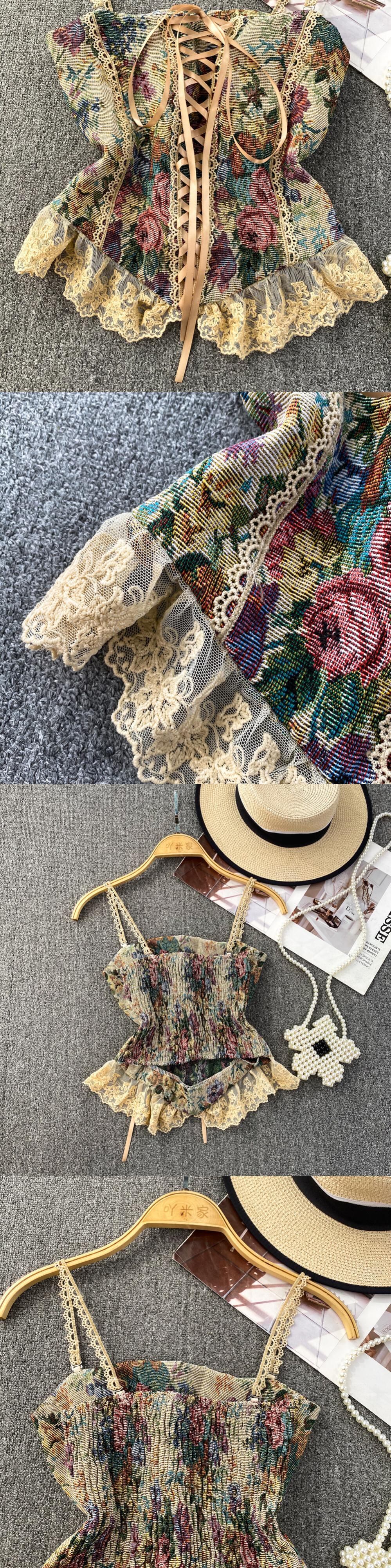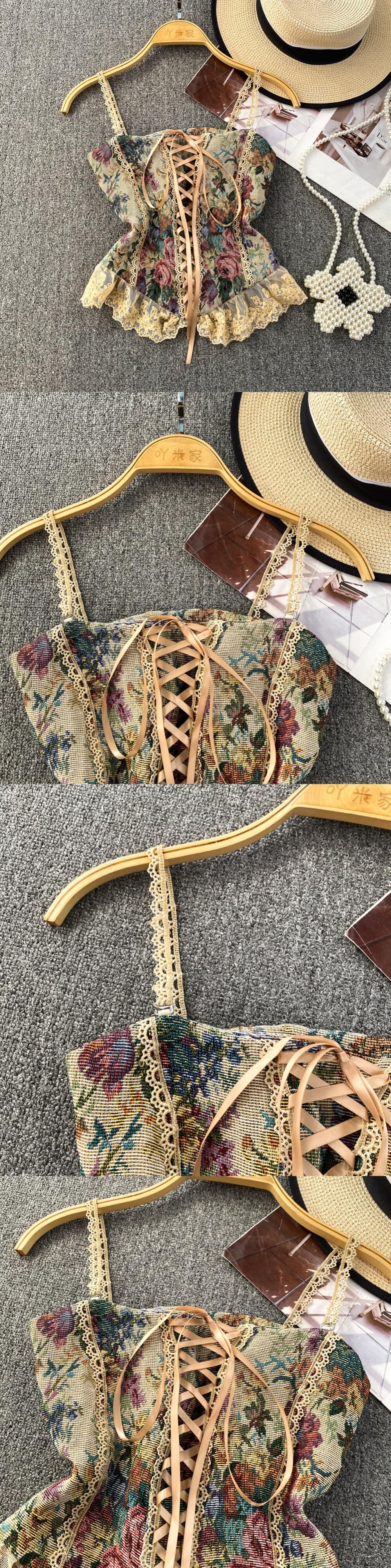 [EWQ] 油絵キャミソールレースパッチワークセクシーレースアップタンクトップ夏潮コントラストスリムトップ サマー 夏物