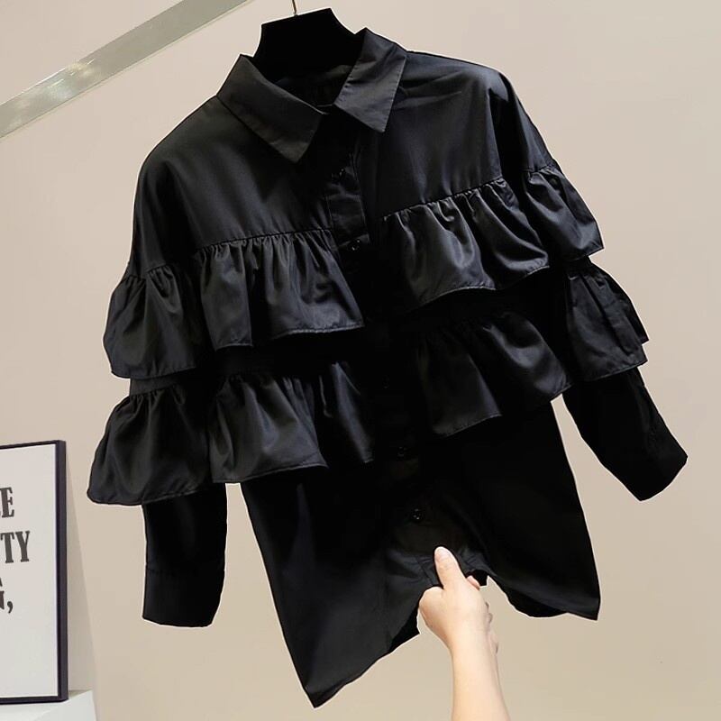 [EWQ] フリルパッチワークシャツバットウィングスリーブルーズグリーン Asual シングルブレストブラウス秋 6O41 ラッフル オータム 秋物