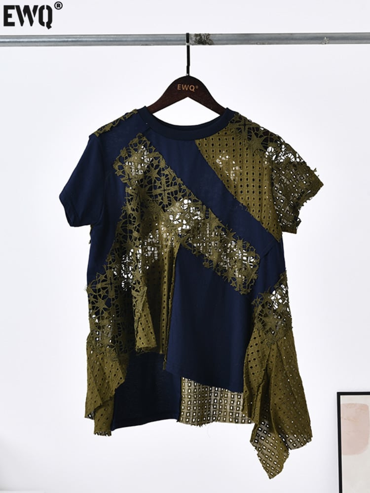 [EWQ]春夏 刺繍ポインテッドスターくり抜きOネック半袖トップス レディース ショート ハーフスリーブ スプリング 春物 サマー 夏物