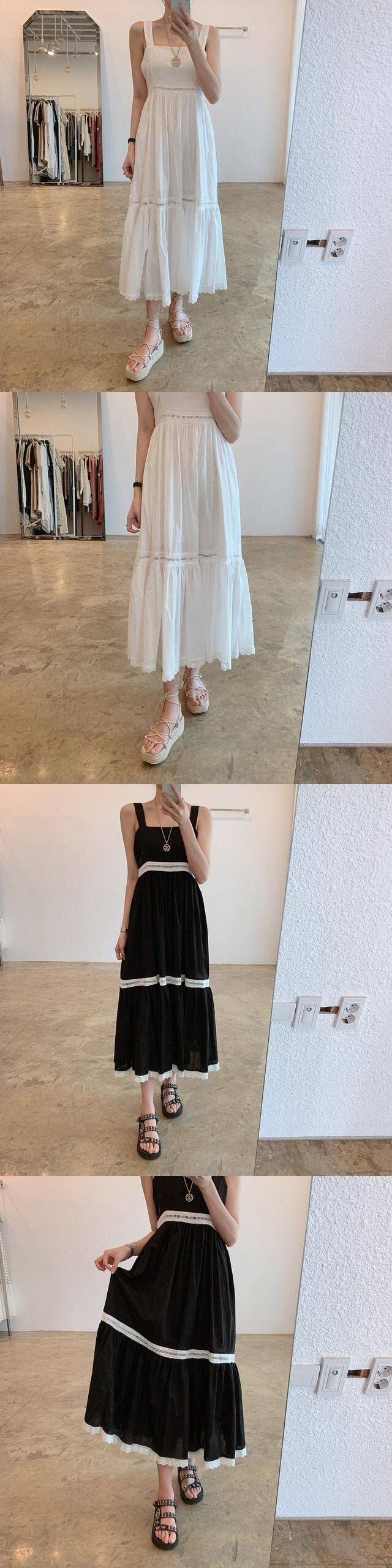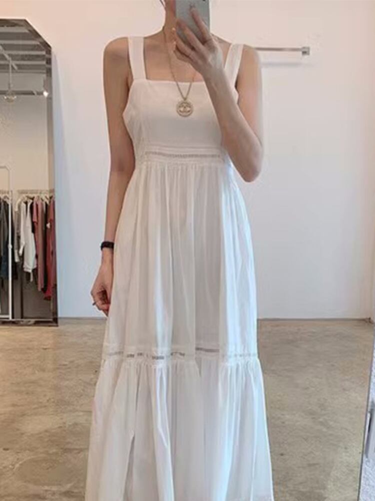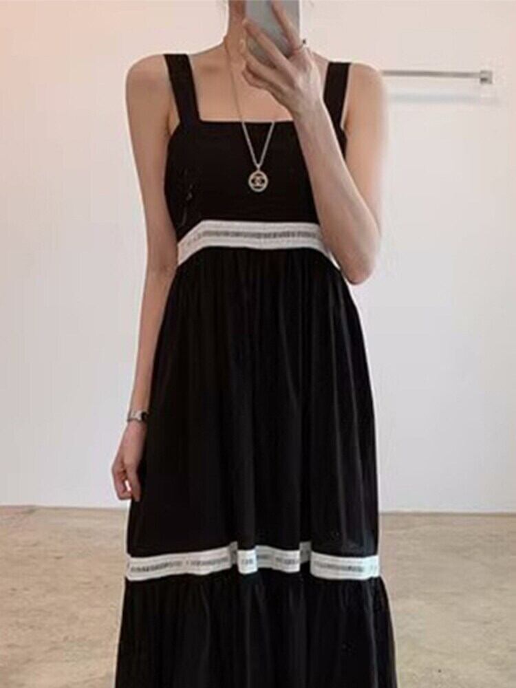 [EWQ] スクエアネックベストドレススリムフィットレースパッチワークコントラストノースリーブドレスサマータイドスリングローブ 夏物 スクウェア