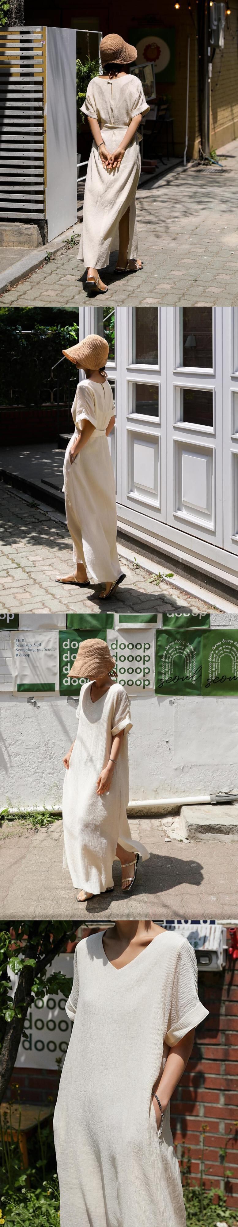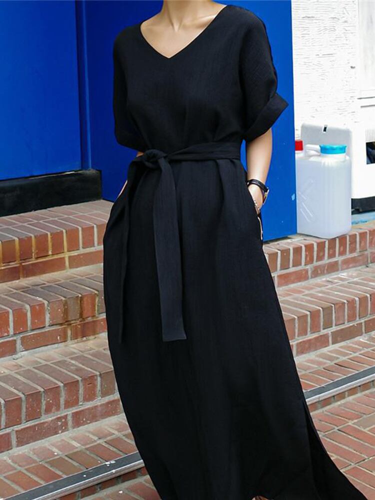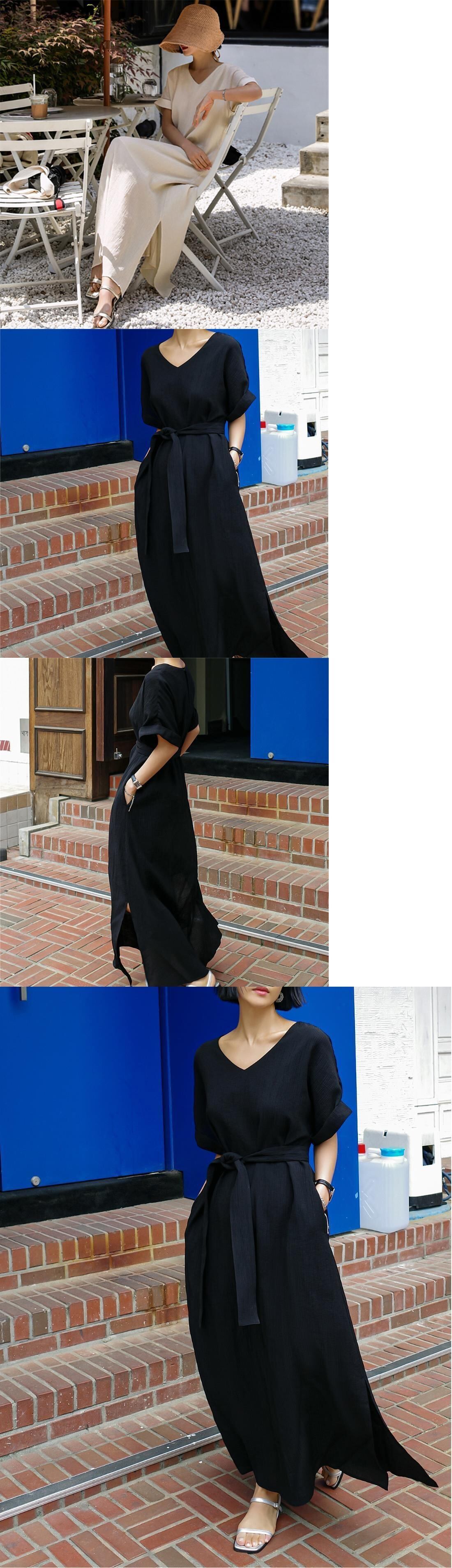 [EWQ] 半袖スプリットドレスルーズ V ネックソリッドカラーレースアップドレス夏潮コットンリネン Vestido ローブ ショート ハーフスリーブ サマー 夏物 Vネック