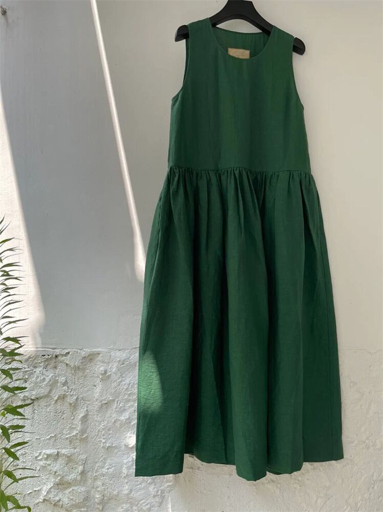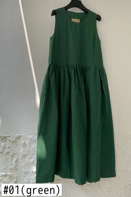 [EWQ] プリーツウエストベストドレスグリーンノースリーブビッグサイズドレス夏潮 O ネック Vestido 16U253 サマー 夏物 Oネック
