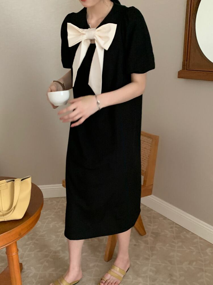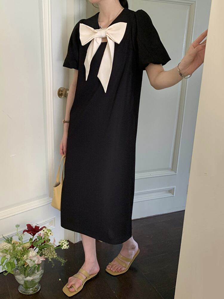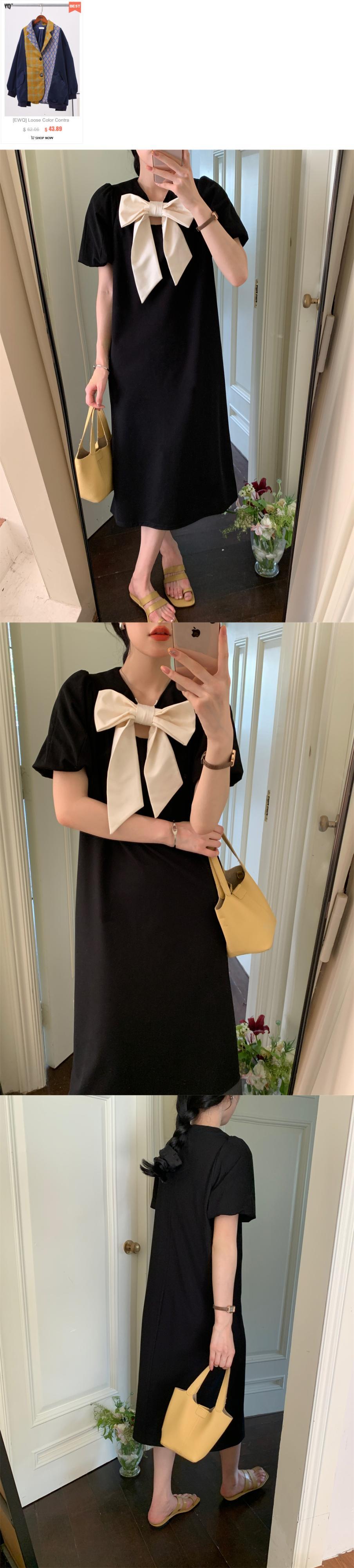 [EWQ] 蝶ネクタイパッチワークドレス夏潮パフスリーブブラック O ネックドレス Vestidos 16U538 リボン サマー 夏物 Oネック