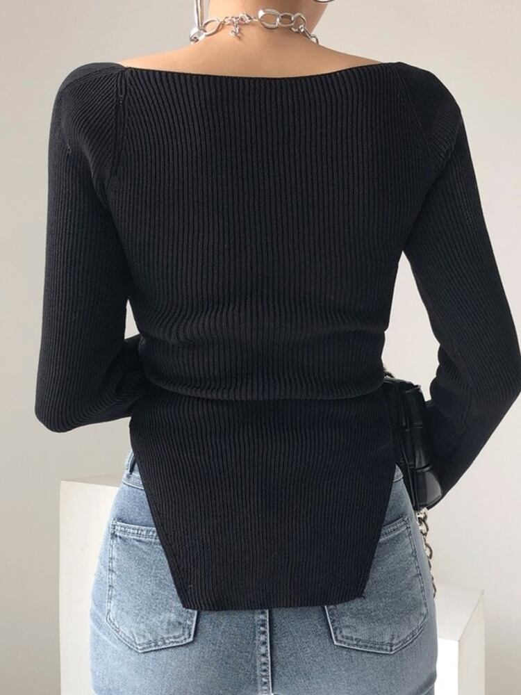 [EWQ] セクシースクエアネックセーター秋薄い潮長袖サイドスプリットスリムプルオーバーニットトップ 16U899 ロング オータム 秋物 スクウェア