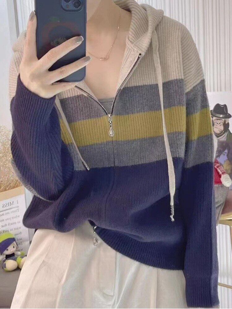 [EWQ] ストライプダブルジップアップフード付きカーディガンコート長袖ルーズレースアップセータージャケット秋 1194 ロング オータム 秋物