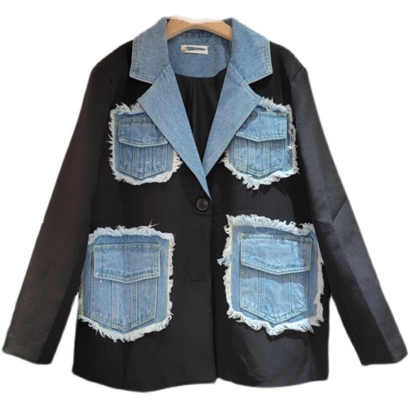 [EWQ] 長袖オフィスレディースシックスーツジャケット秋デニムパッチワークブレザー美しいコート U1274 ロング オータム 秋物 会社 学校 通勤や通学にも