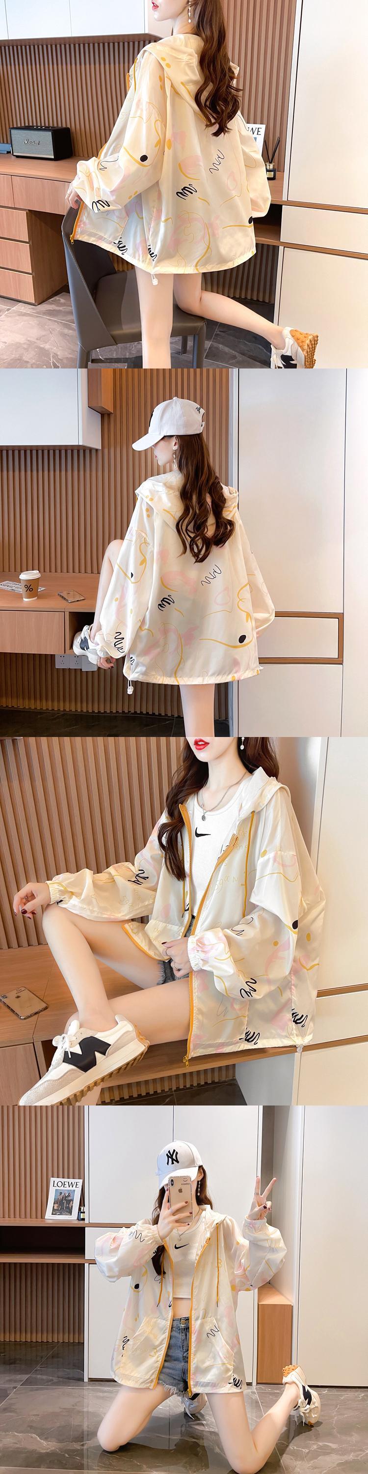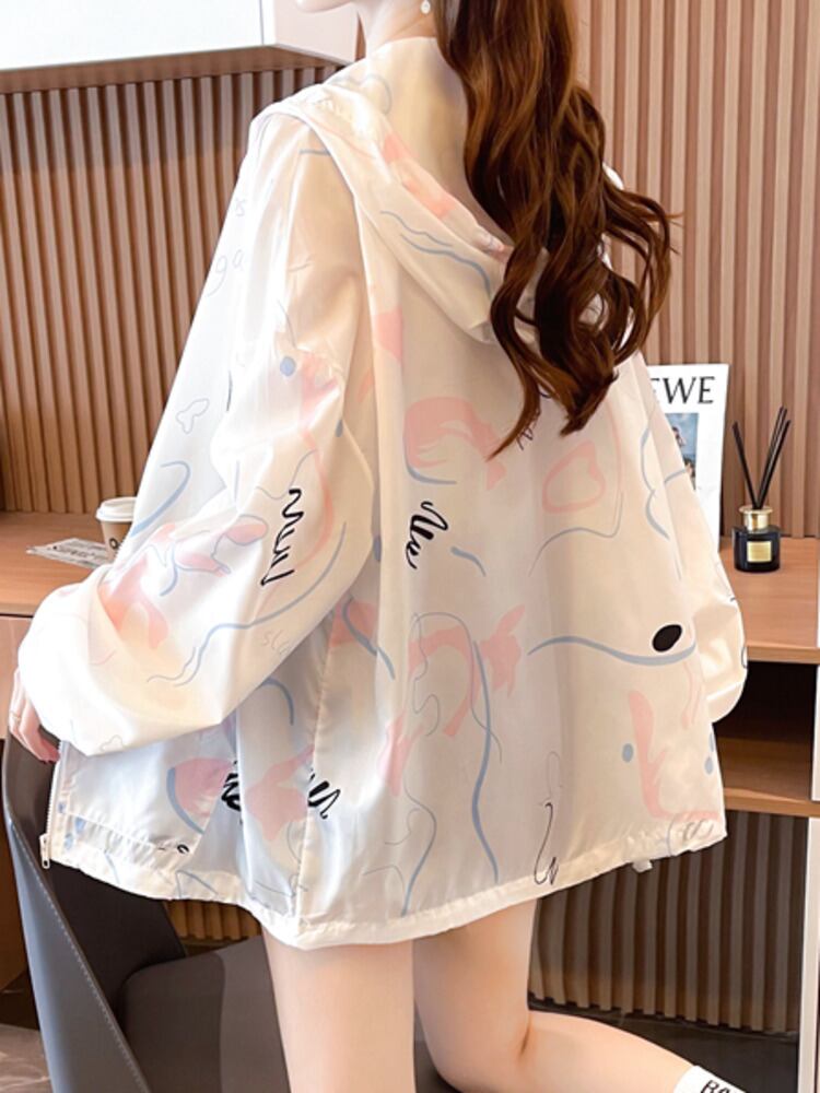 [EWQ] 薄いジッパーサマージャケットアウターウェアランタンスリーブプリントコントラストカラールーズフィットフード付きコート潮 夏物