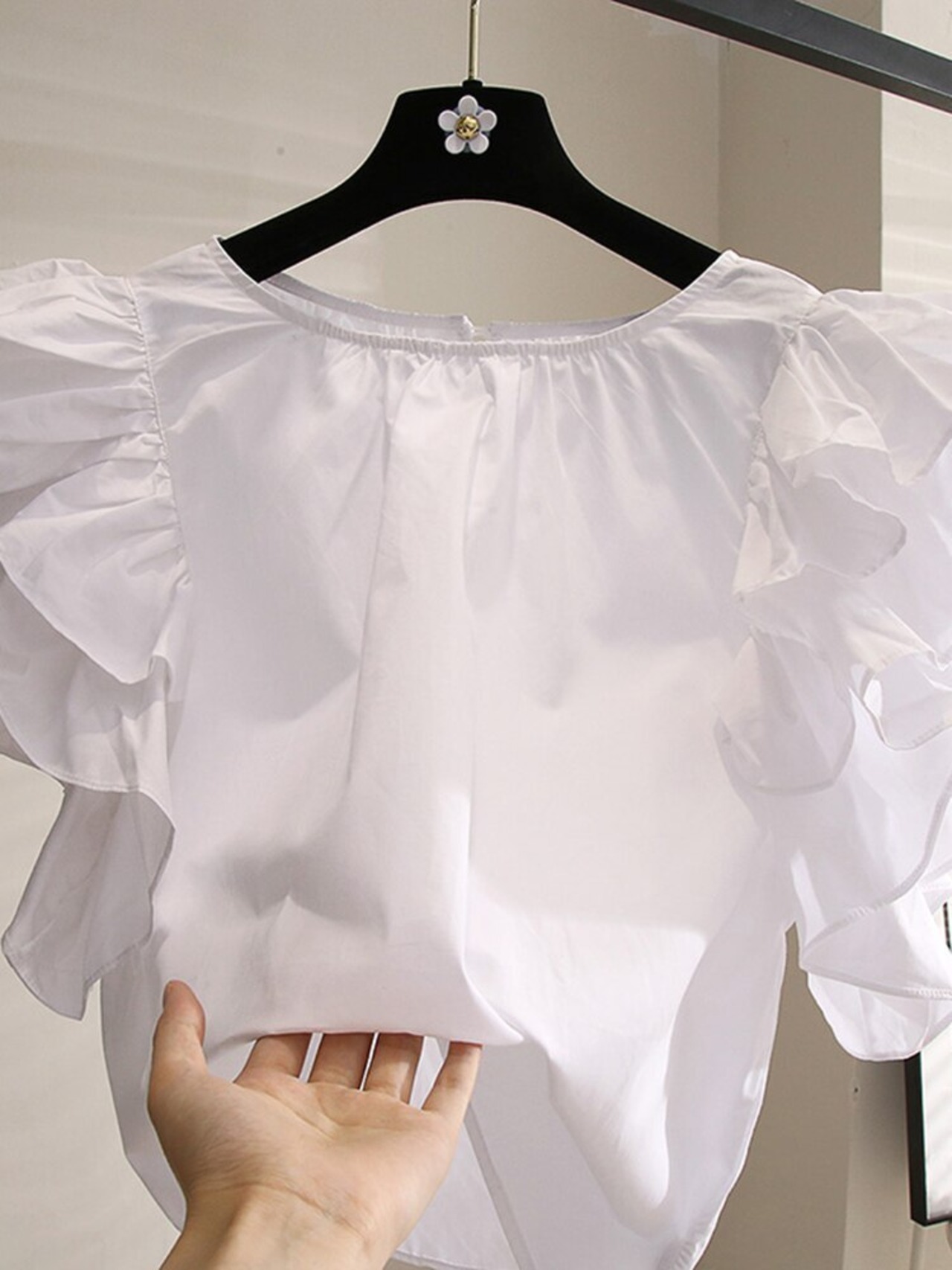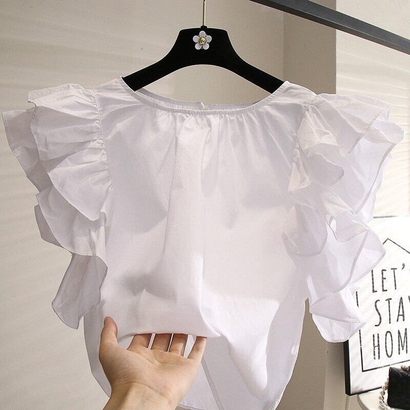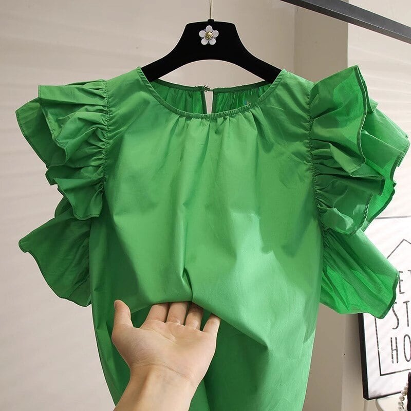 [EWQ] フリルパッチワークグリーンシャツフライングスリーブルーズ O ネックサマータイドブラウストップ 16O43 夏物 Oネック