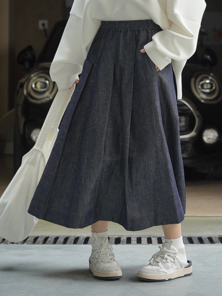 [EWQ] デニムリネン A ラインスカートウエスト弾性ルーズオールマッチ服夏潮スカート エラスティック 伸縮 サマー 夏物 Aライン