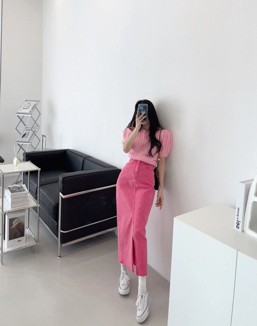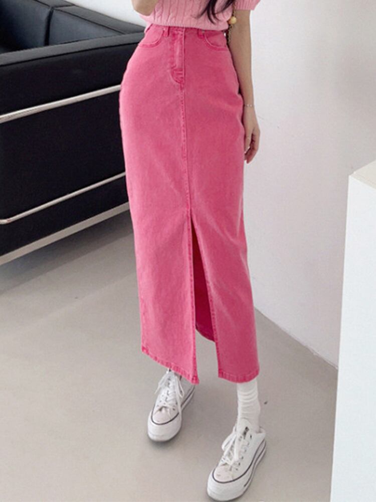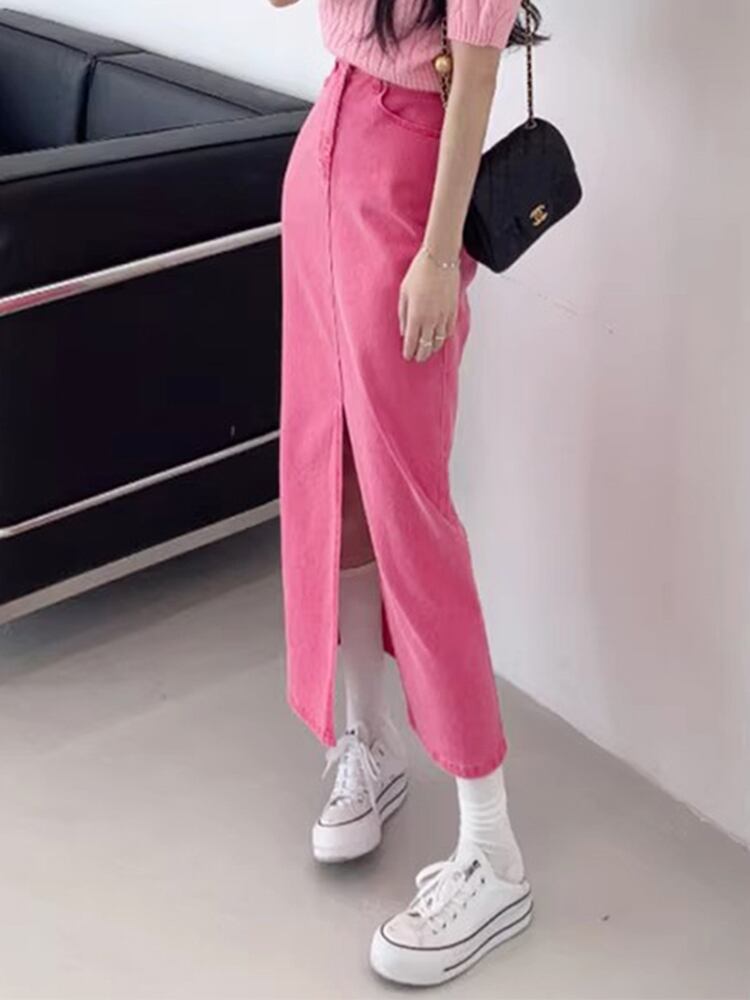 [EWQ] シックウエスト分割パッケージヒップデニムスカートスリムピンクスカート秋トレンド 16O380 オータム 秋物